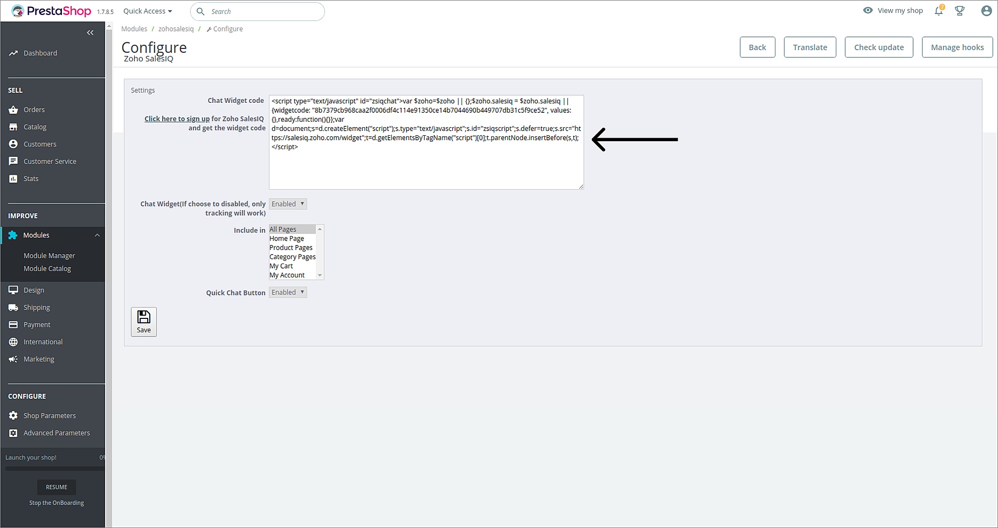 After uploading the SalesIQ plugin, the module will start to install. Once, installed, click Configure.