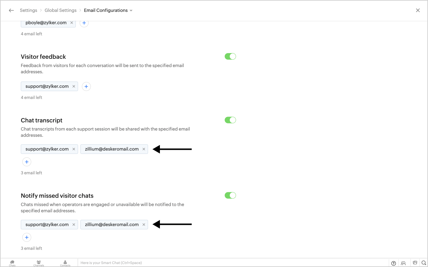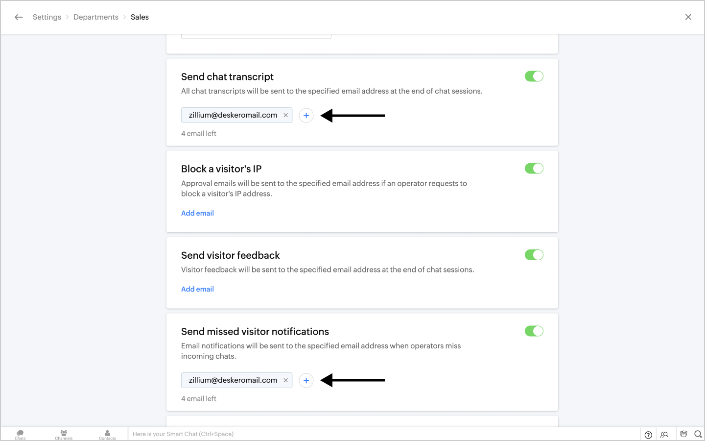 Configuring your Deskero support email in Zoho SalesIQ portal ensures all the chats transcript are sent irrespective of department or embeds within your portal. You just have to add your Deskero support email in the portal configurations of Zoho SalesIQ.