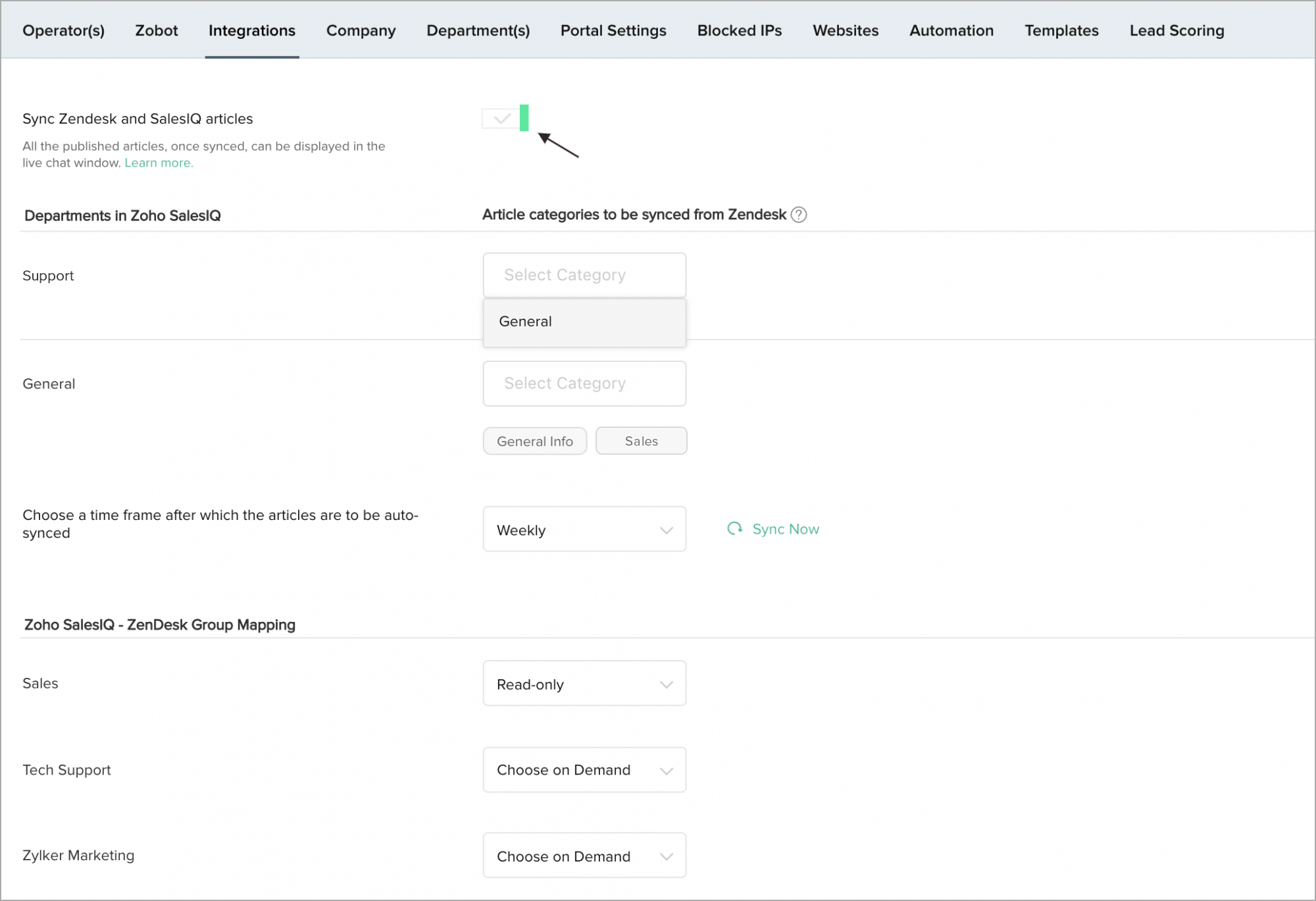 - You can map a Zendesk category to only one SalesIQ department but you can map a department with multiple article categories.