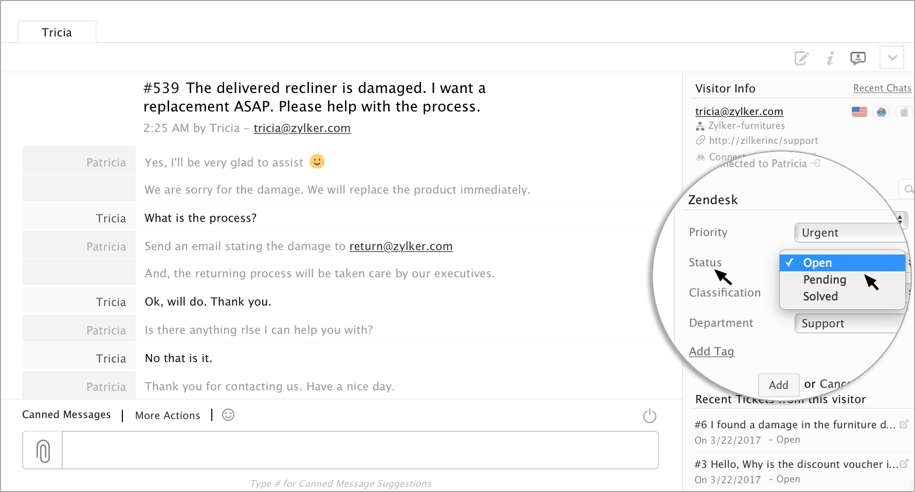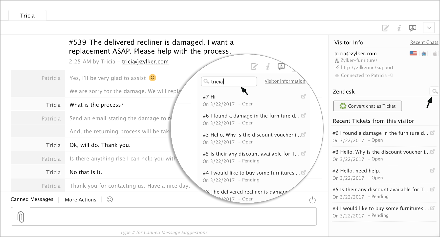 While chatting with, your agents can also search for tickets from Zendesk by visitor name, ticket number, a visitors email address, or even by a requests subject.