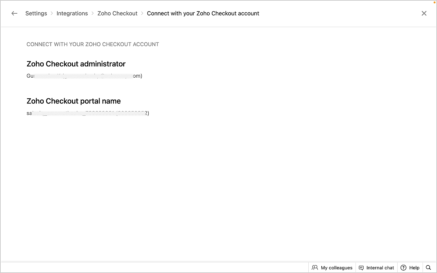 - Once you have integrated successfully, you can view the name and email address that was used to create the integration under Zoho Checkout administrator along with the Zoho Checkout portal name in the Connect with your Zoho Checkout Account section.