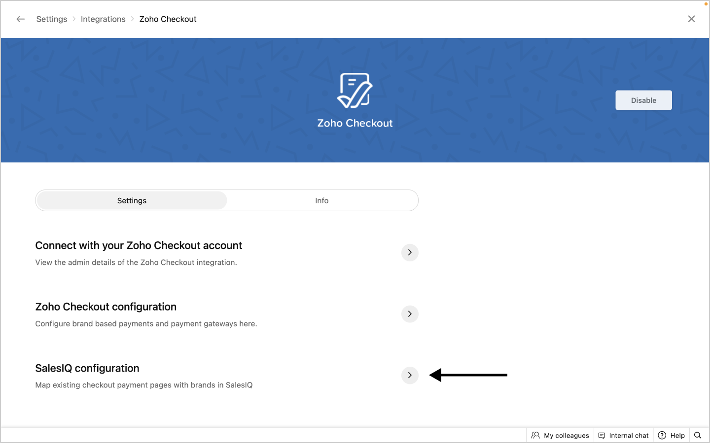 - Click on SalesIQ Configuration on the Zoho Checkout integration page.