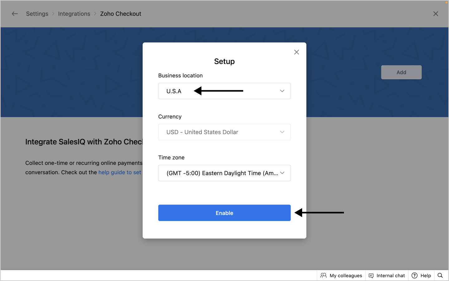 In this section, you can set up the configurations from SalesIQ end for your Checkout integration.