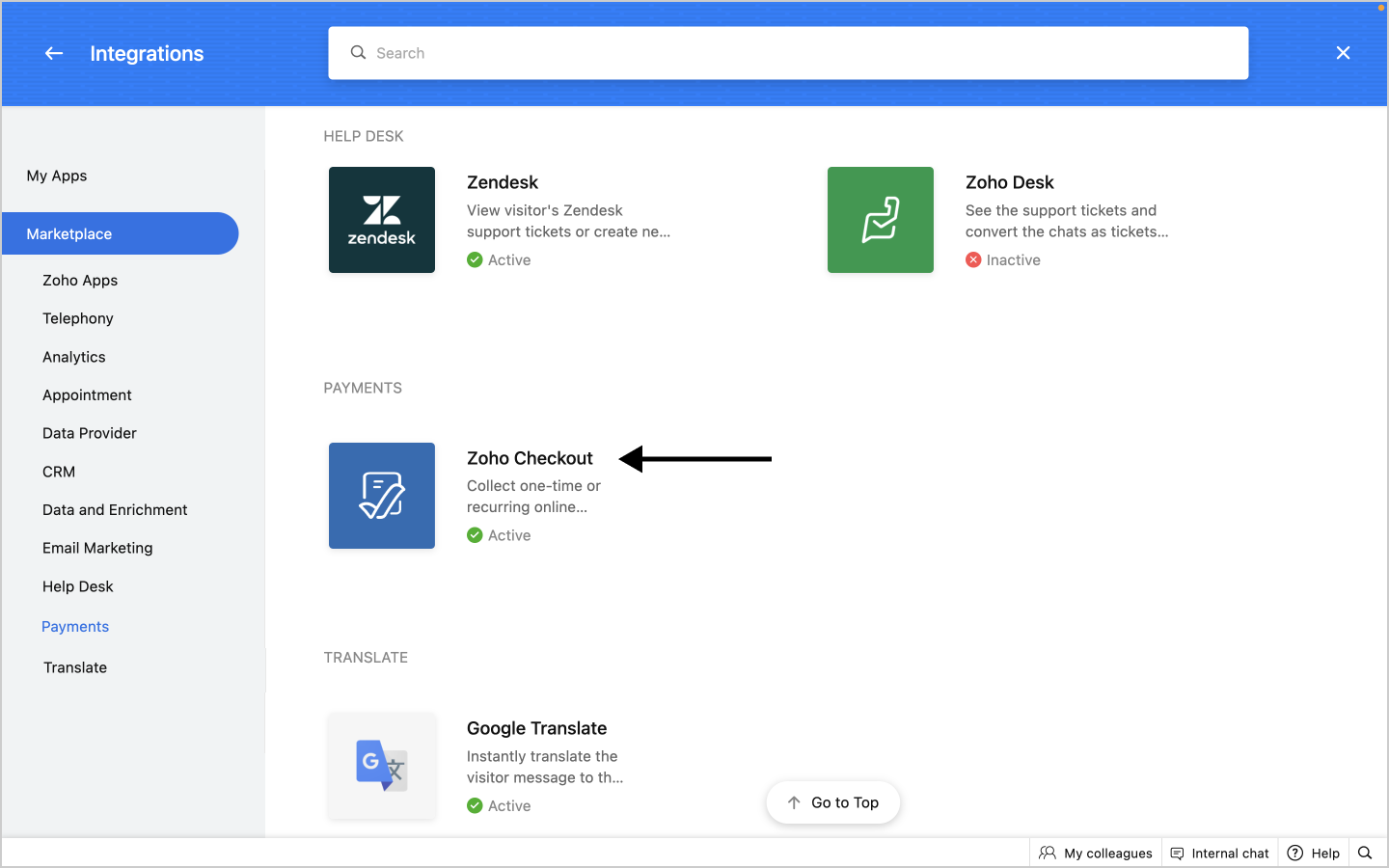 - Navigate to Settings > Developers > Integrations > Payments and click on Zoho Checkout.