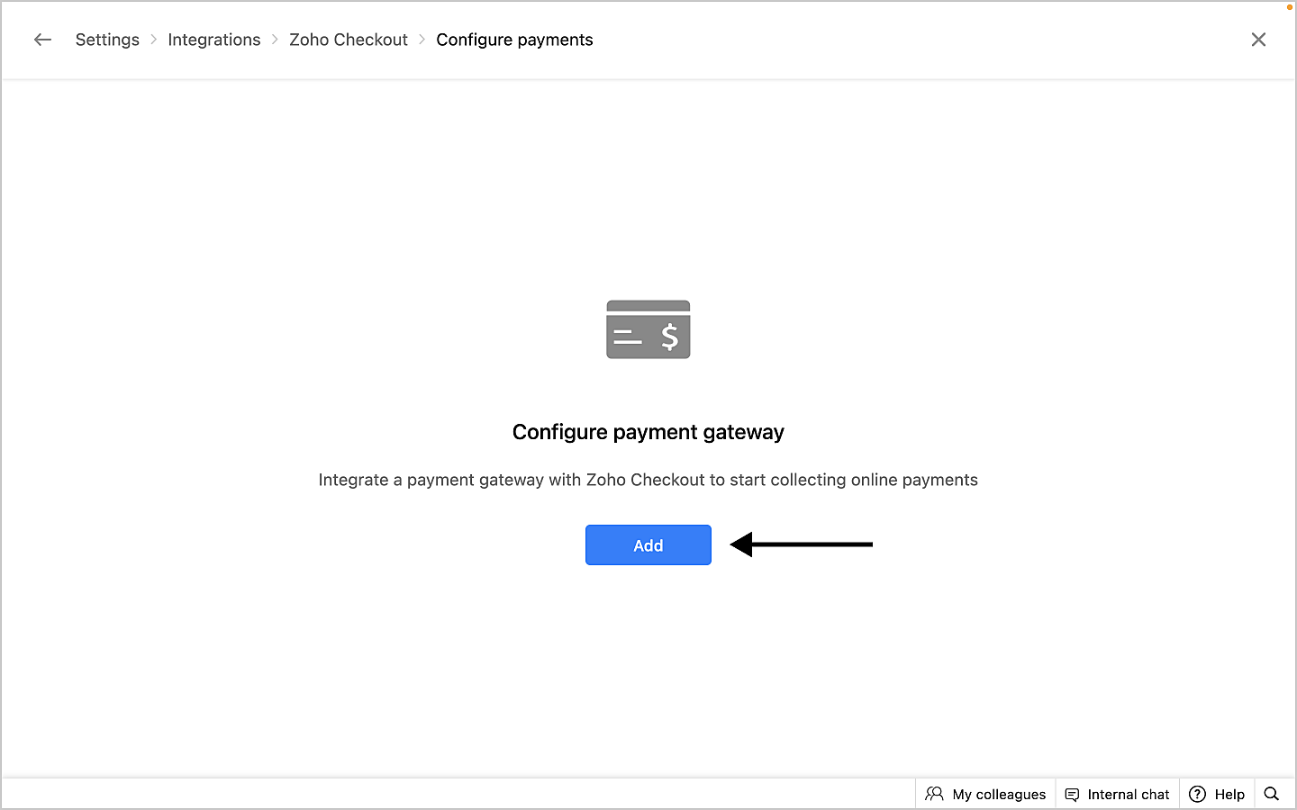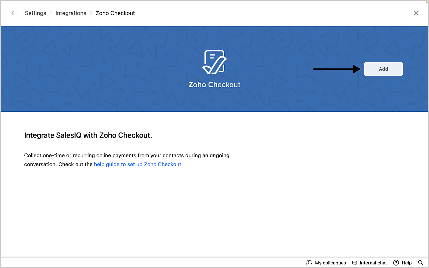 - Click on Add at the top-right corner to link your Zoho SalesIQ account to your existing Zoho Checkout account.