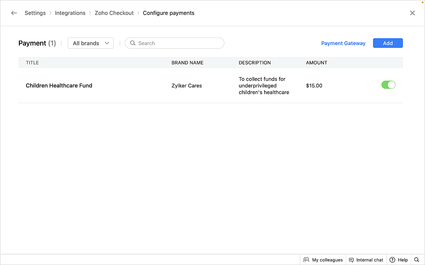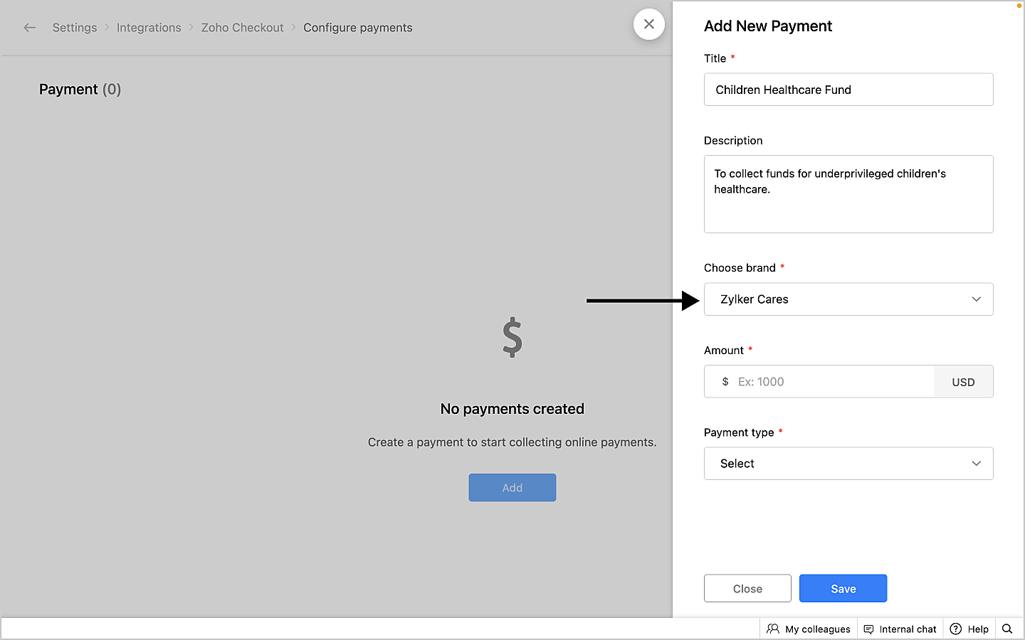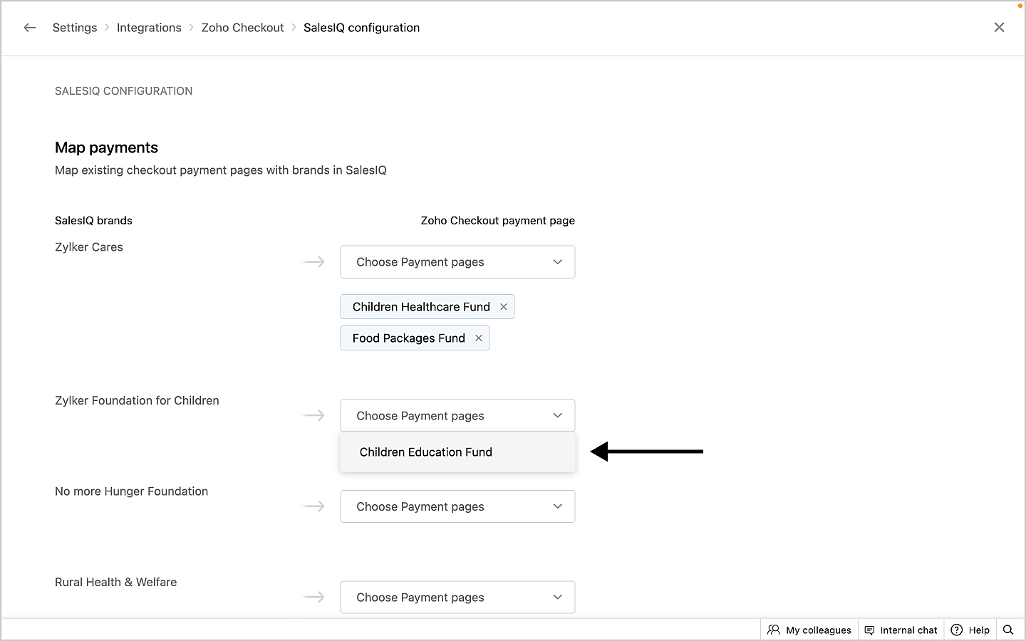 - Here, you can map existing checkout payment pages that you have added on the payments section, with your brands on SalesIQ.