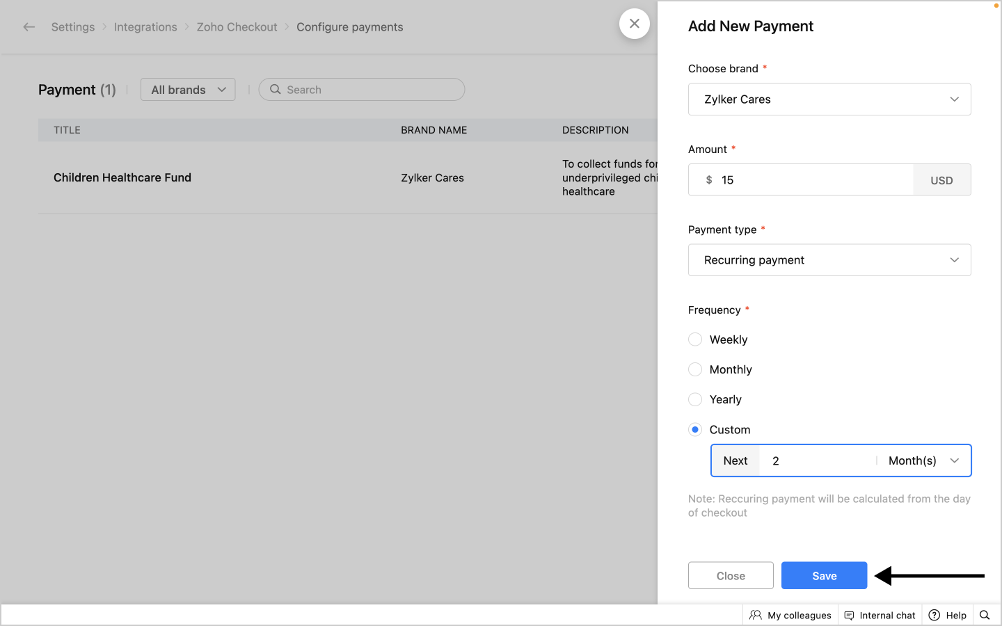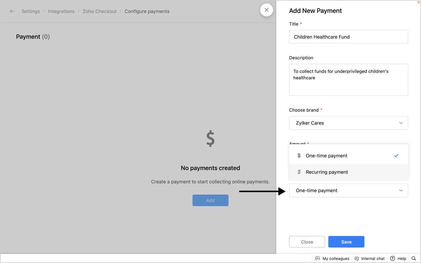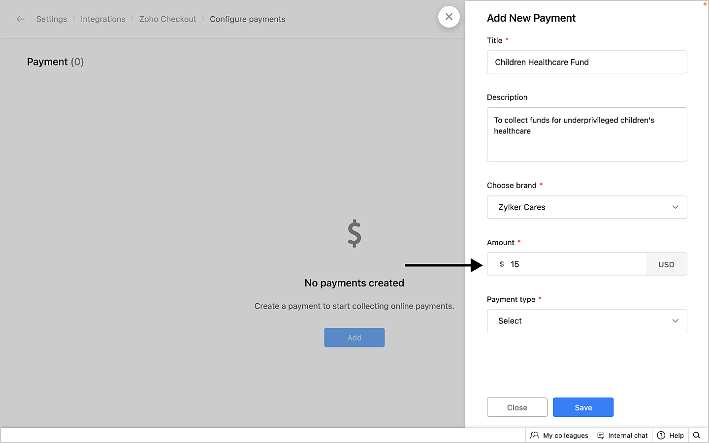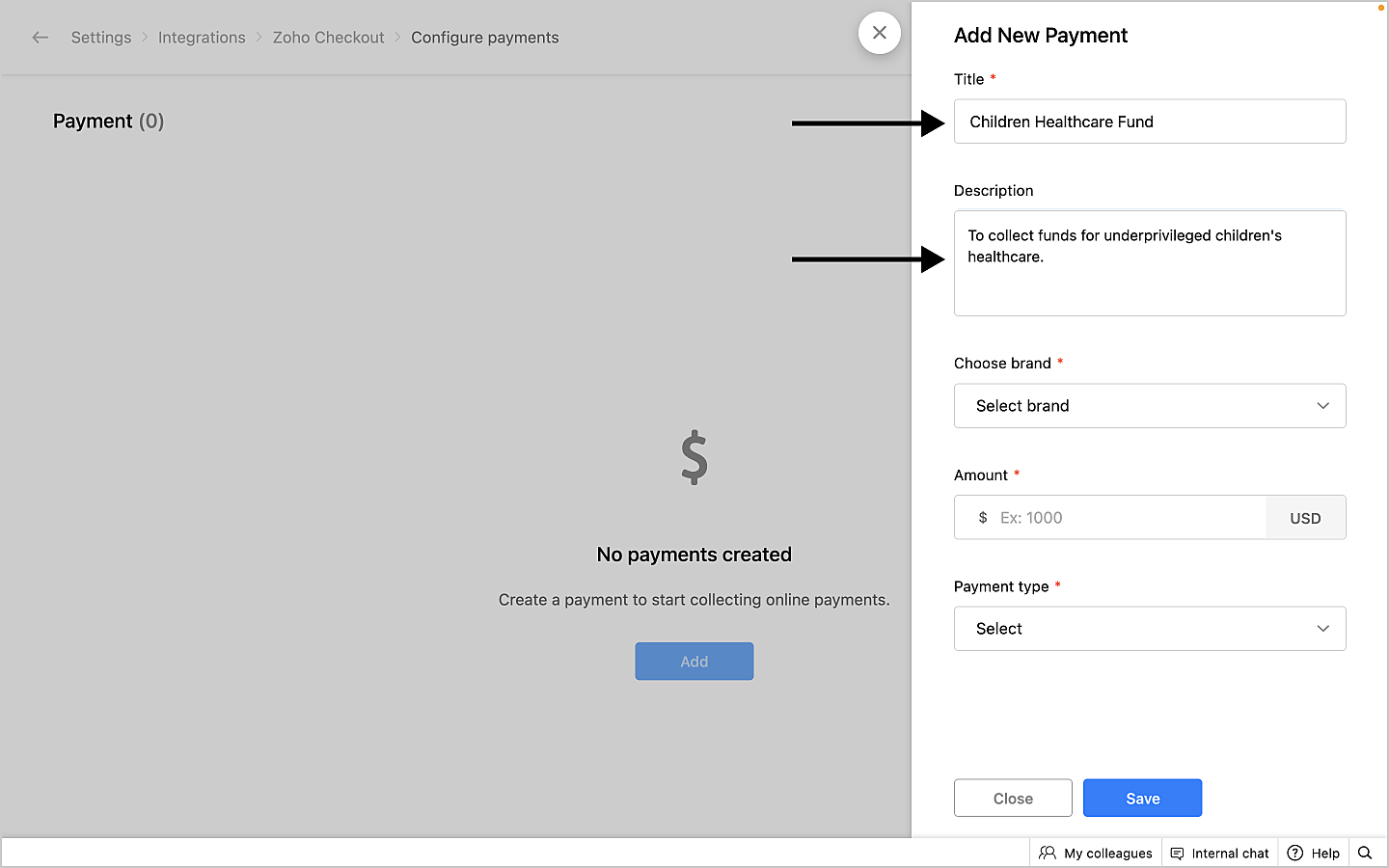 - Here, you can map existing checkout payment pages that you have added on the payments section, with your brands on SalesIQ.