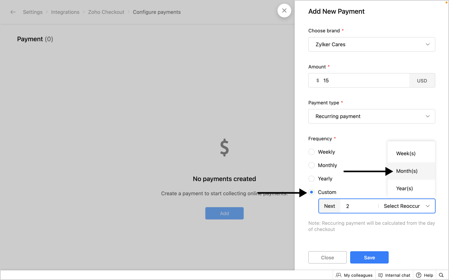- Recurring Payment - This option can be used to bill the payer at regular intervals. Choose the Frequency from the available options. You can also add Custom Frequency as needed.
