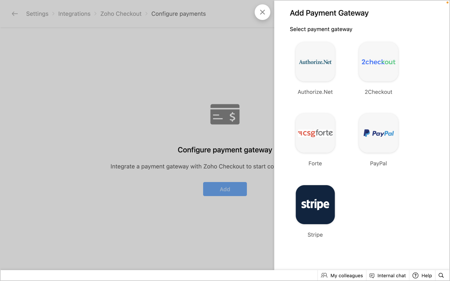 Note: The Payment Gateway list provided will be based on the Checkout edition chosen for integration. Only the supported gateways for the particular edition will be displayed.Each payment gateway has a separate configuration flow for passing credentials. Follow the links below to check out the flow for each Gateway addition. List of Payment Gateways supported on SalesIQ are as follows.
