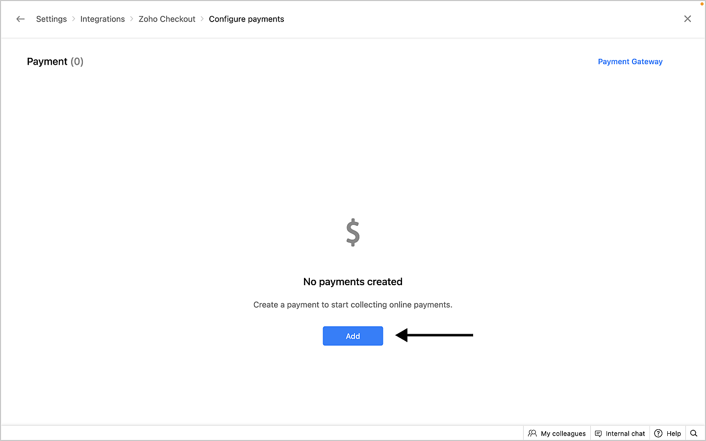 Here, you can create your Payment Gateway via Zoho Checkout to start receiving online payments.