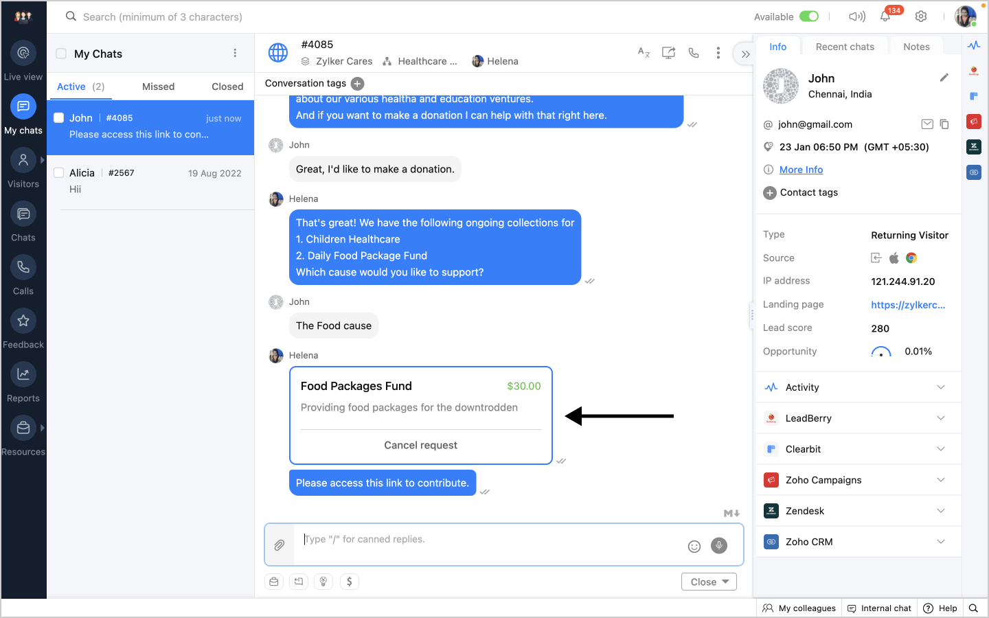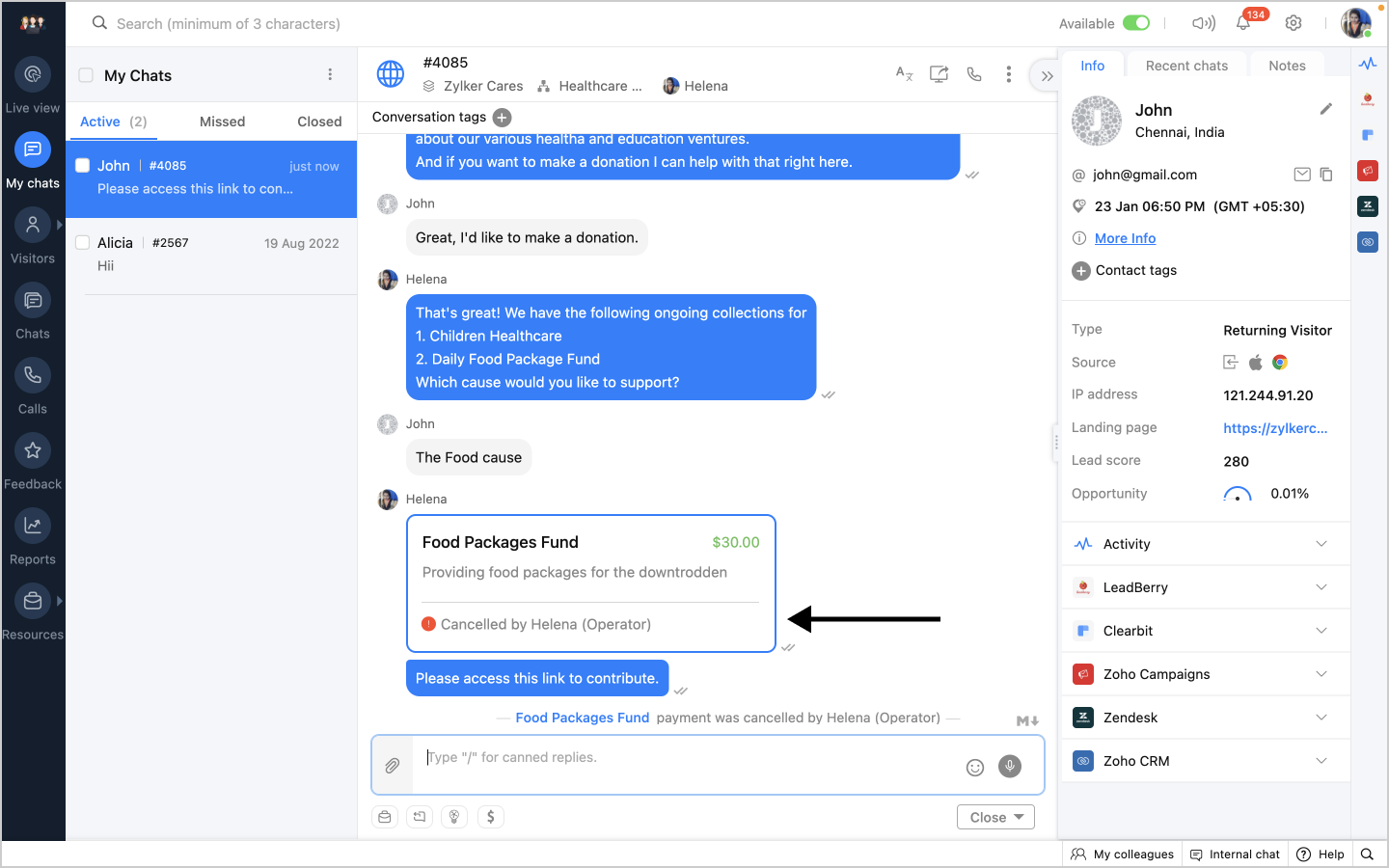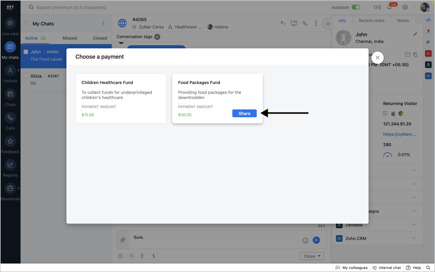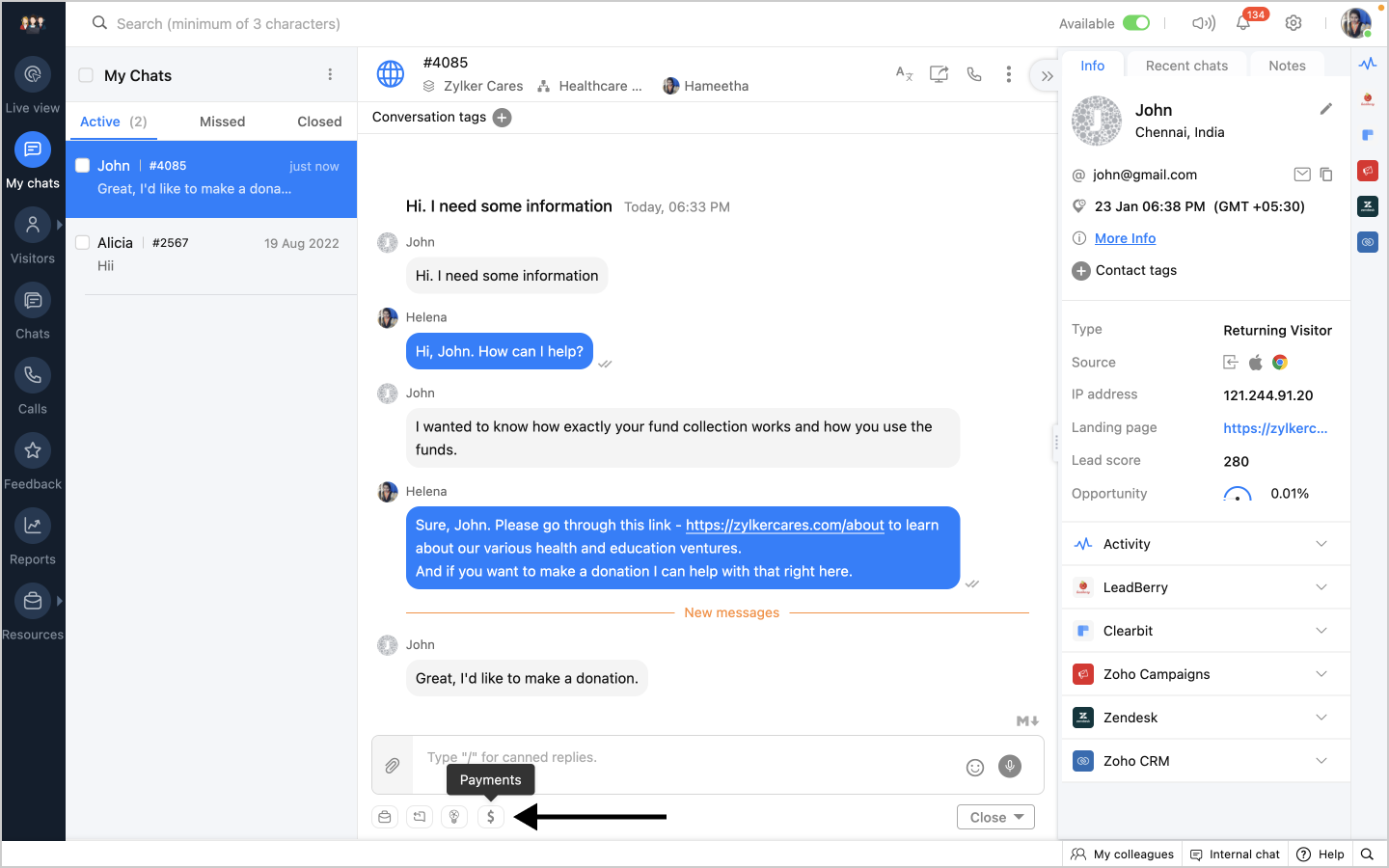 When in conversation with a website visitor, if a payment needs to be made by the visitor for a particular service, the operator can share a custom link for the requirement and the customer can make payments immediately by clicking on the link and providing payment details.