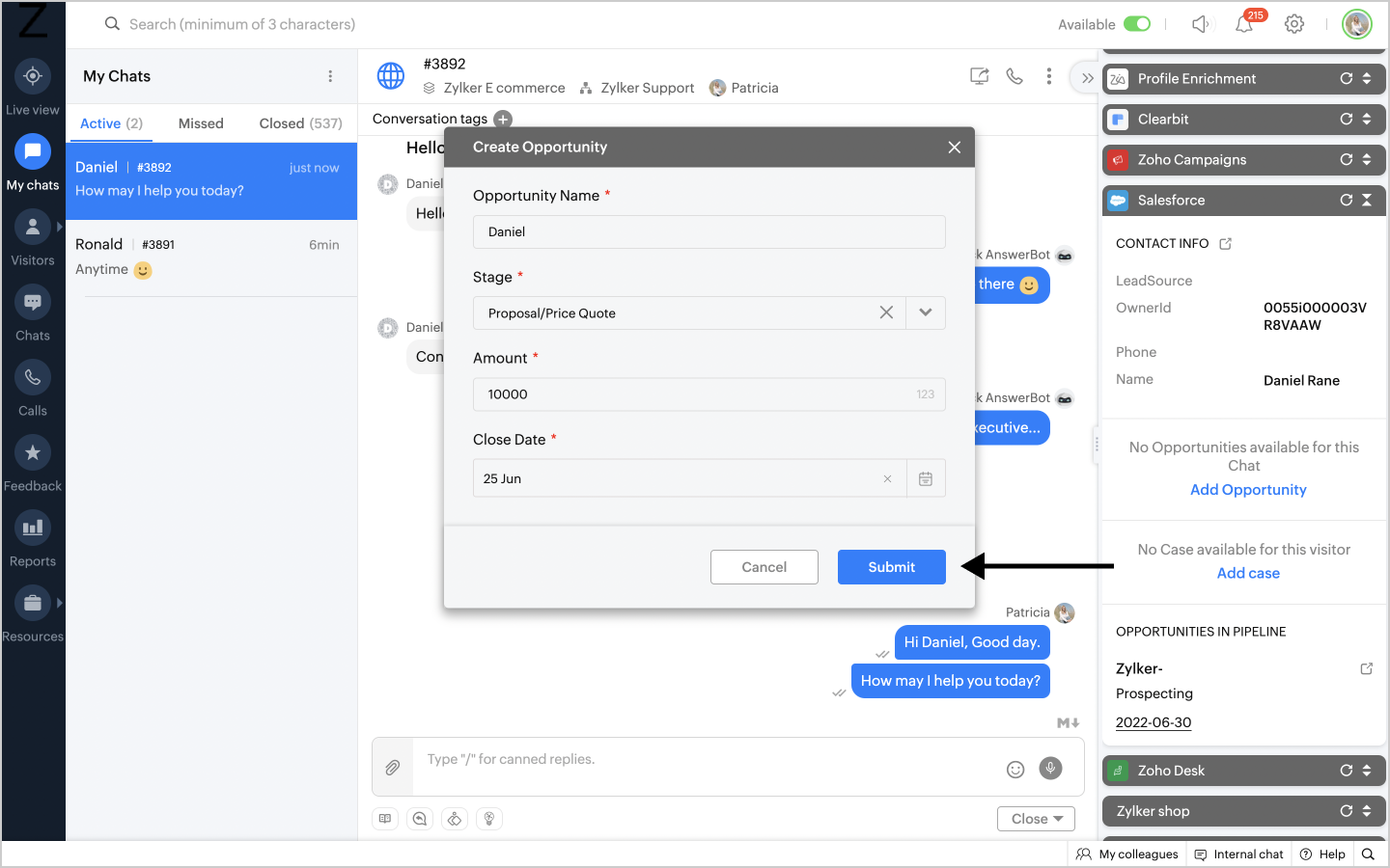 Salesforce allows you to add an Opportunity for your contacts right away from the chat window,