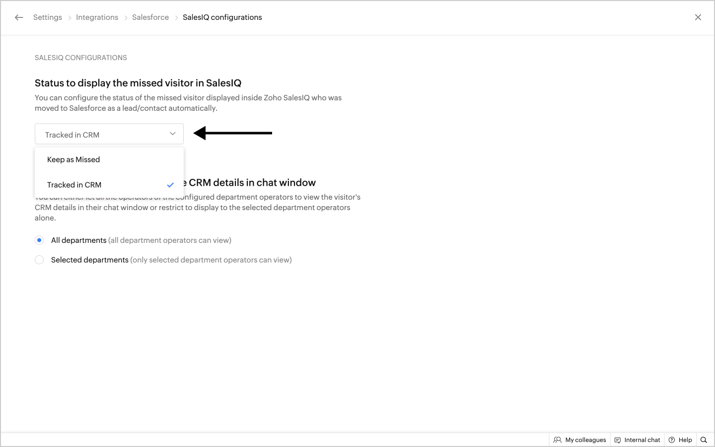 - If you are planning on pushing your missed visitor base into Salesforce CRM, you get to decide whether you would like to handle the missed visitor chats either in your Zoho SalesIQ account itself or in your Salesforce account.