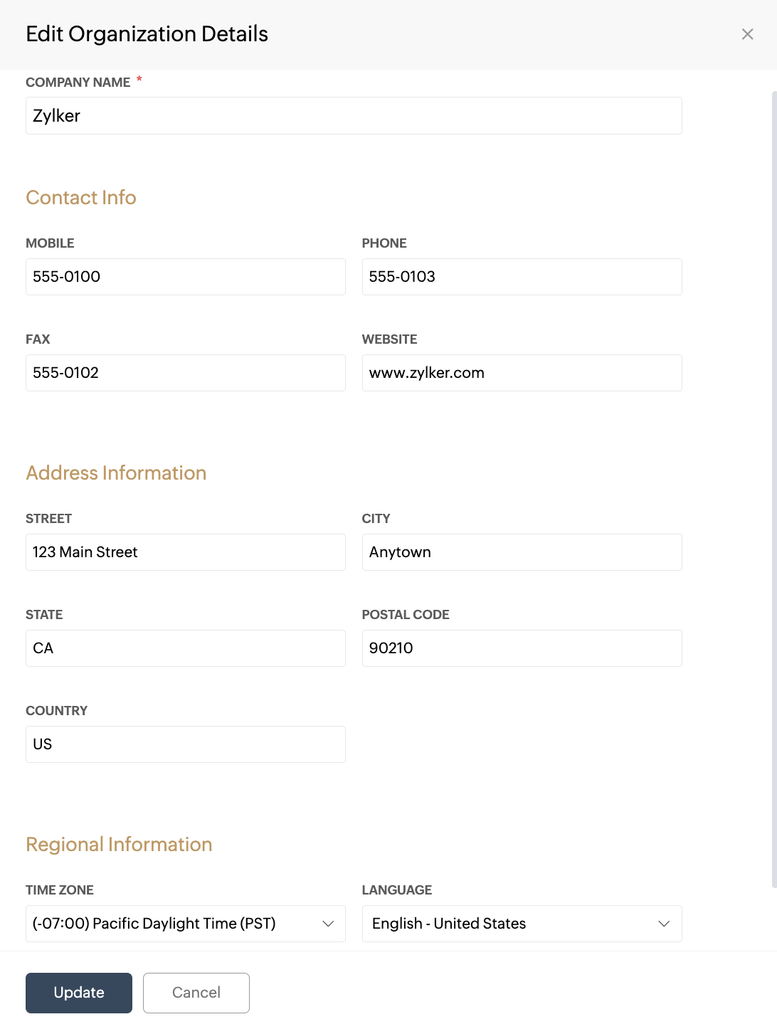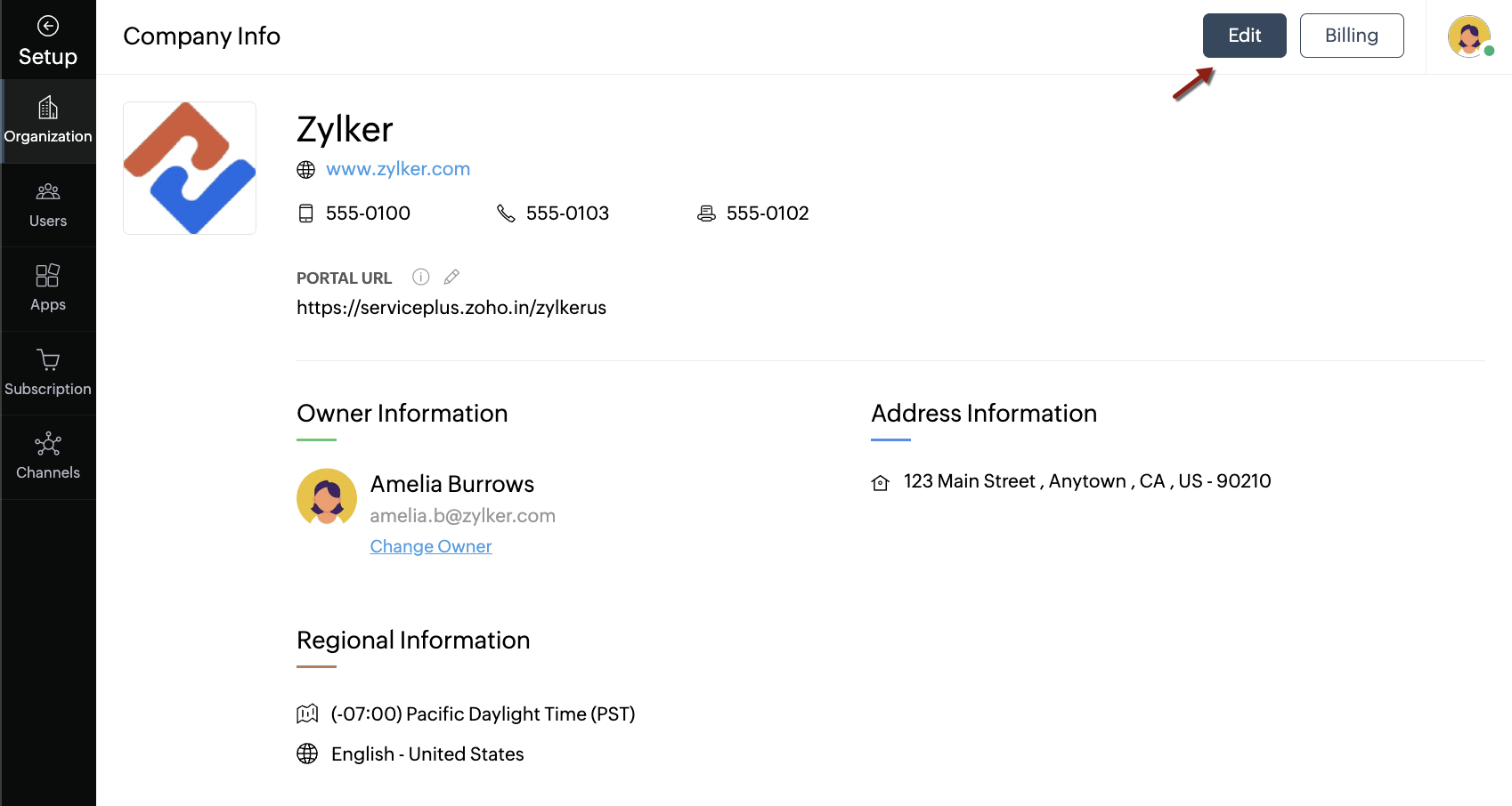 The Organization page shows all the essential information about your company, such as logo, website, mobile and telephone numbers, fax, portal URL, account owner, address, time zone, and language.