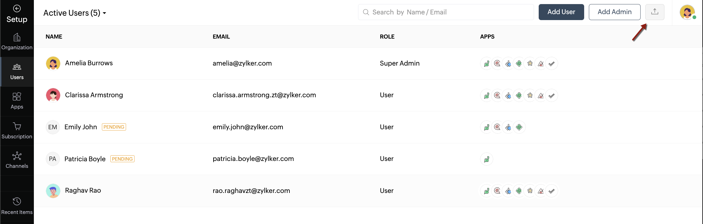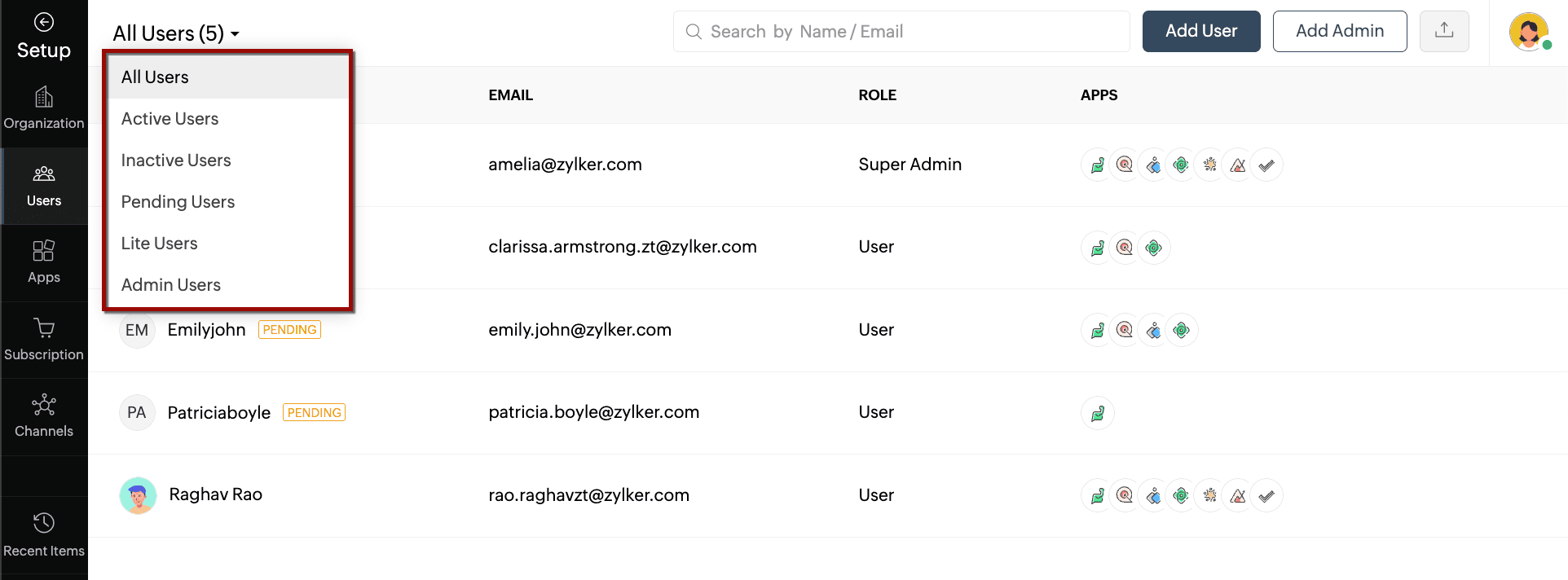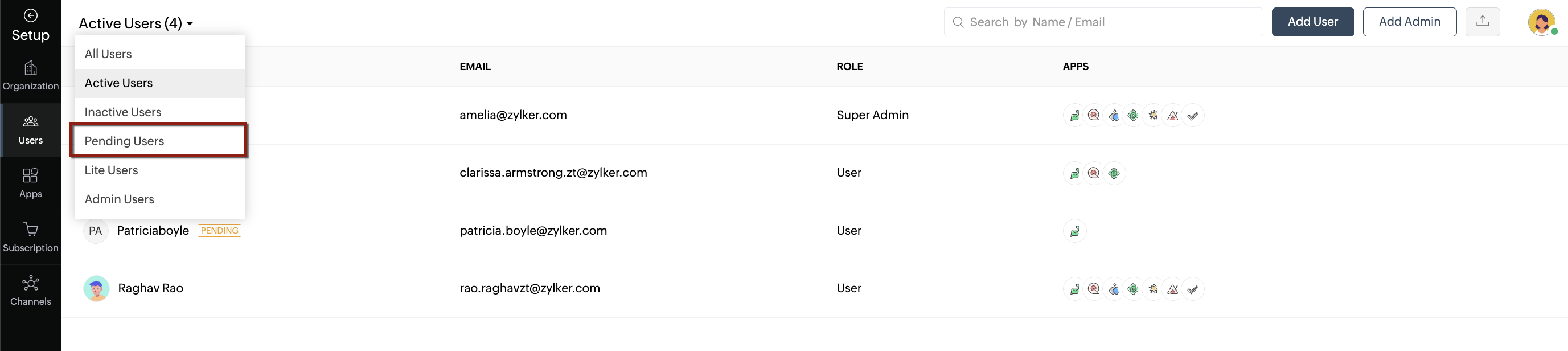 - Pending Users: Displays users who have yet to accept the email invitation they received.
