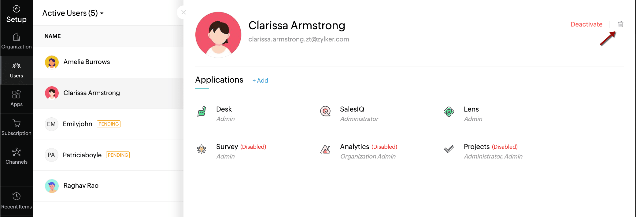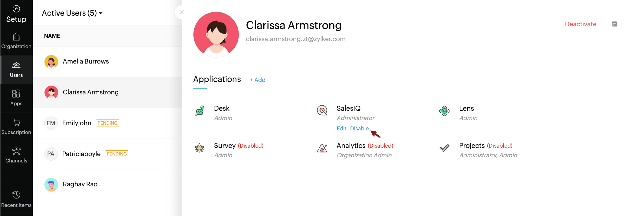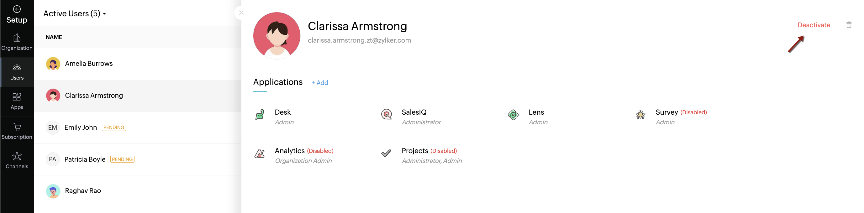 The user information panel slides open. - Click Deactivate from the top-right corner.