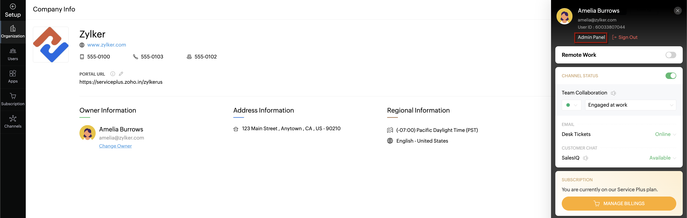 - Sign in to your Zoho Service Plus account as an owner.