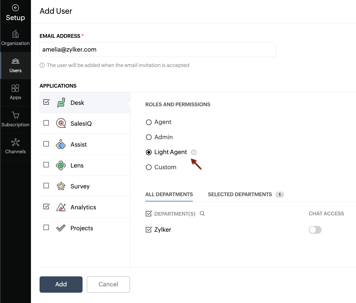 Lite users are specific to Analytics and Desk applications in Service Plus. If you assign a lite user to an application besides these, that user will consume one regular license seat of your subscription. Let's say you want to add a user already assigned as a light agent in Desk to SalesIQ. You can only add them if you have an additional license seat available in Service Plus.
