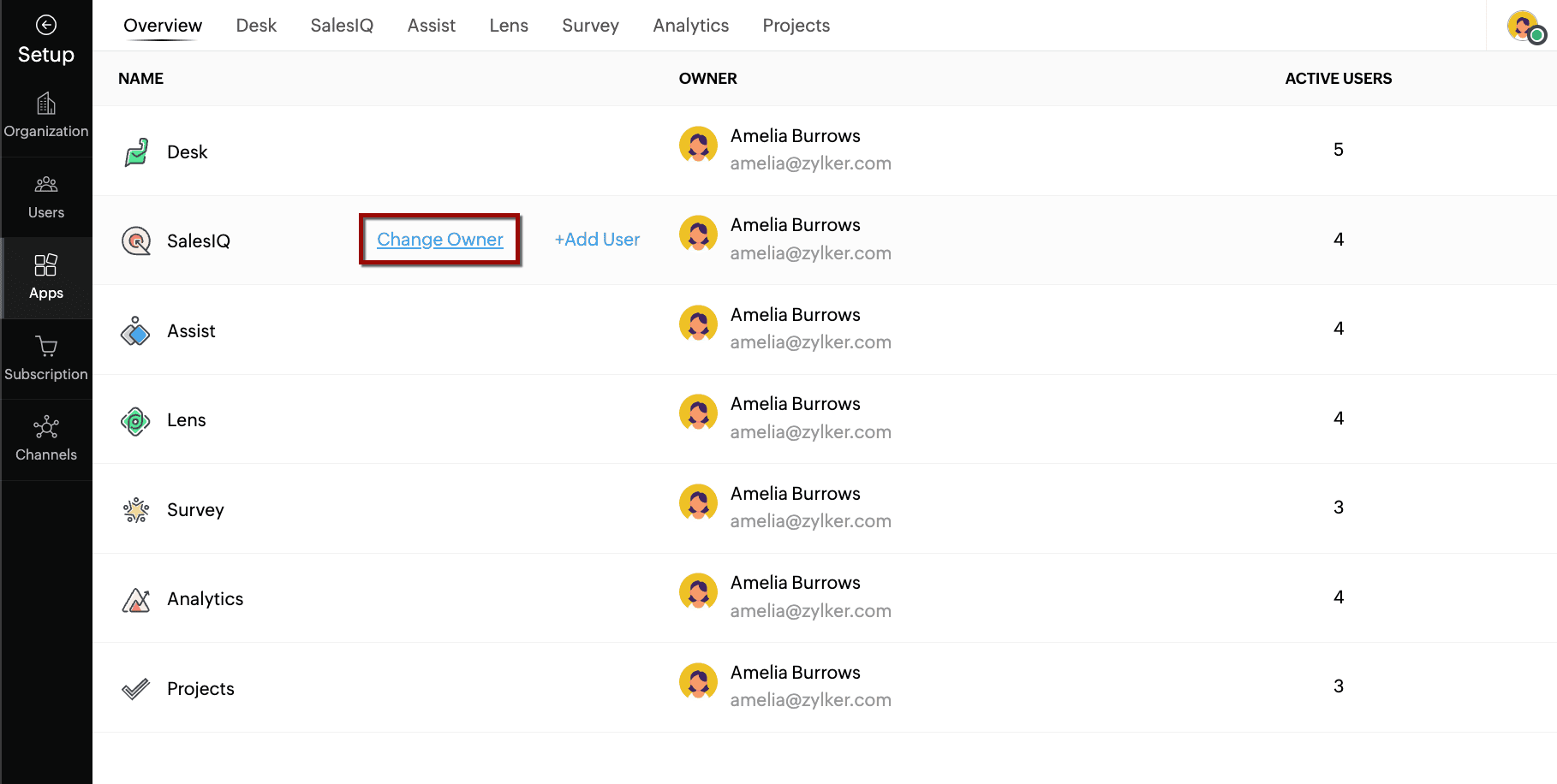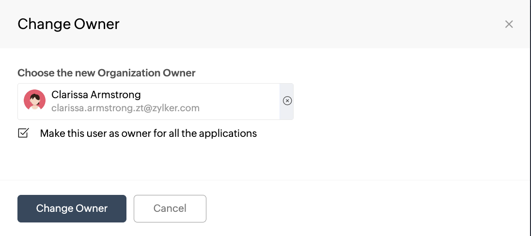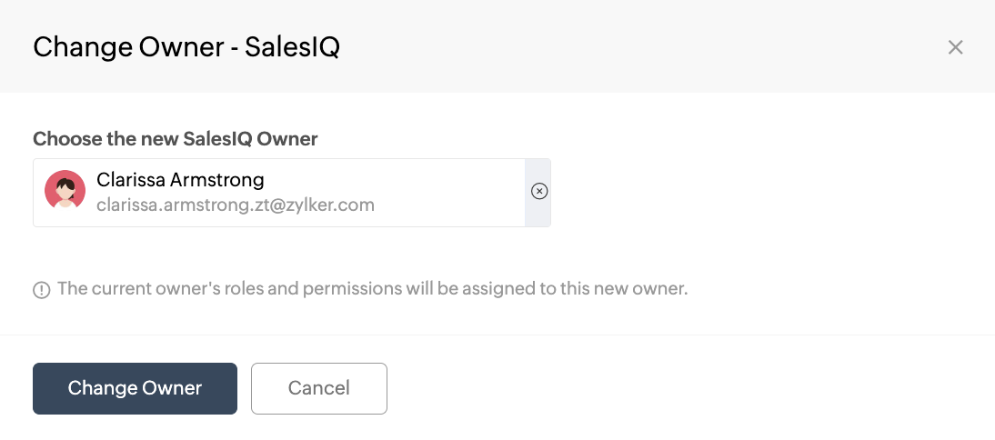 For example, if you want to change the SalesIQ owner, hover the cursor over SalesIQ and click Change Owner corresponding to the application.