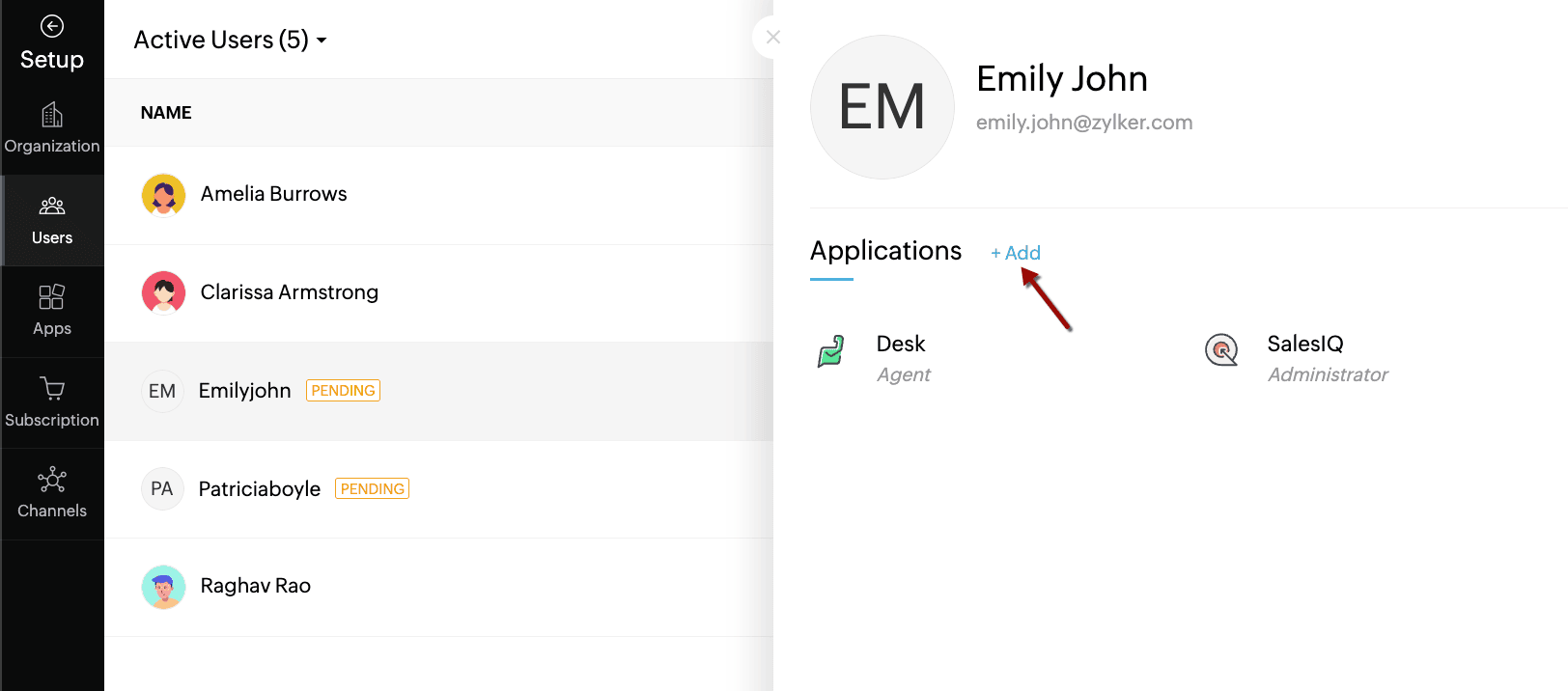 The Users page will open by default. - Hover your cursor over the application column corresponding to a user and click Add.