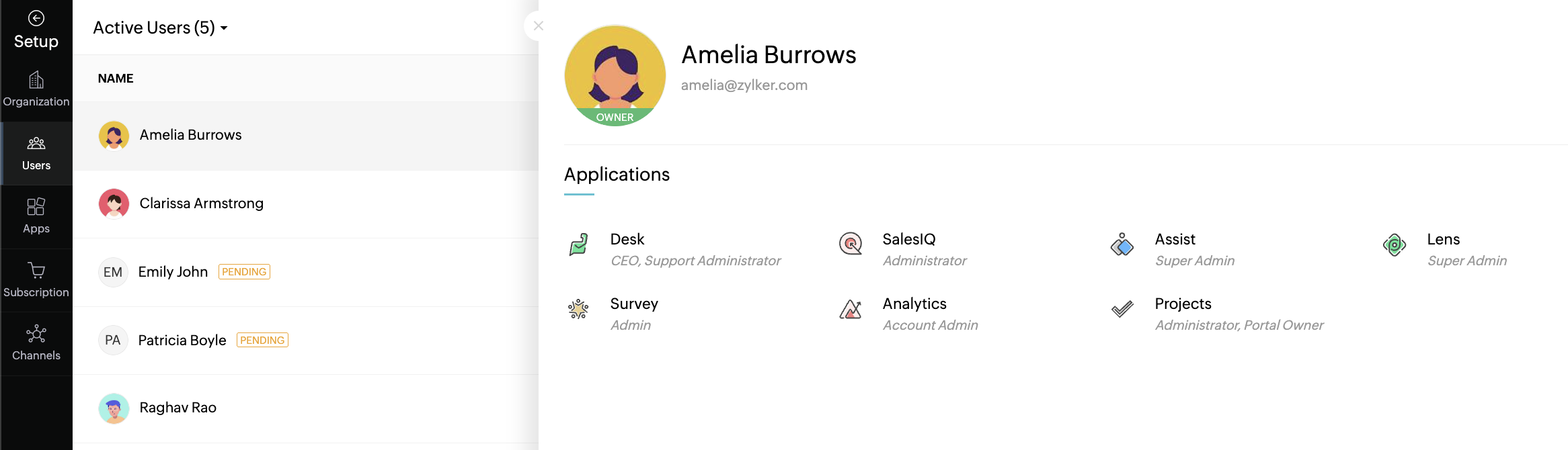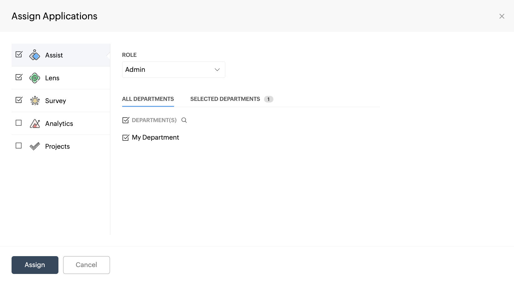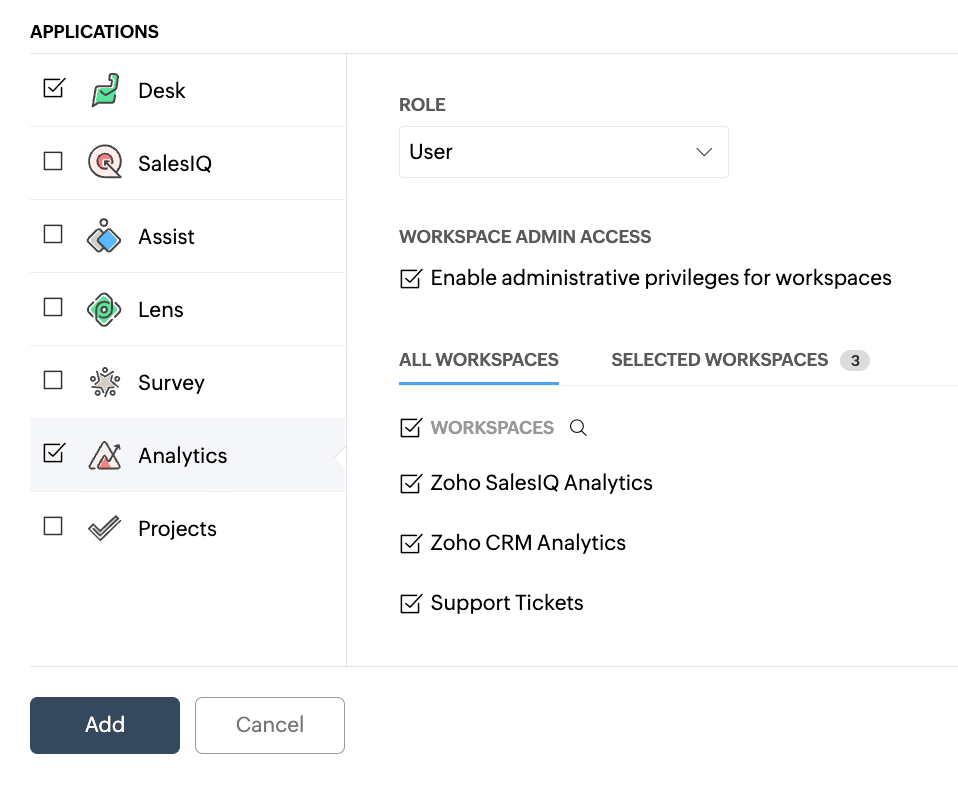 - Application Administrators: Administrators are users who can administer the respective application they are assigned to. For example, suppose a user is given an administrative role in Desk and a non-administrator role in Projects, Survey, and Assist. In that case, they can administer all tasks on Desk, but they will have access based on their role assigned in the other applications.