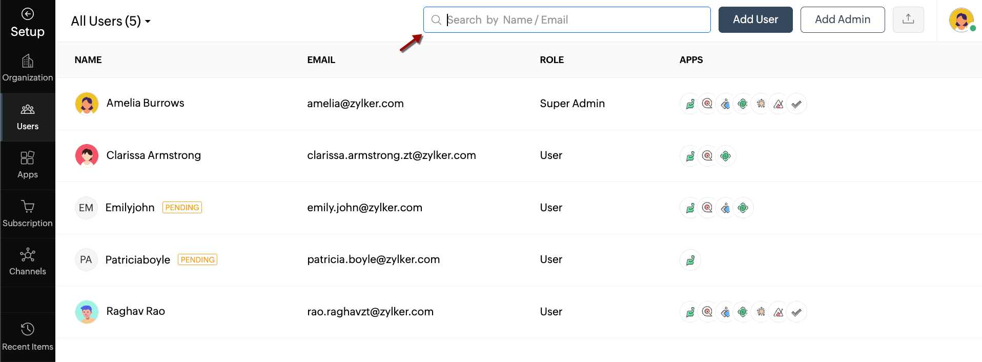 - To search for users, click the Search icon in the first column alongside Name/Email.
