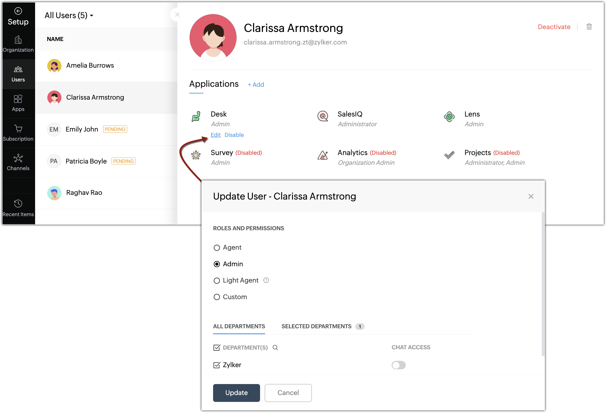 You can edit users' profiles, roles, departments, and other application-specific information anytime. In addition, you can disable users from accessing specific applications in Service Plus.