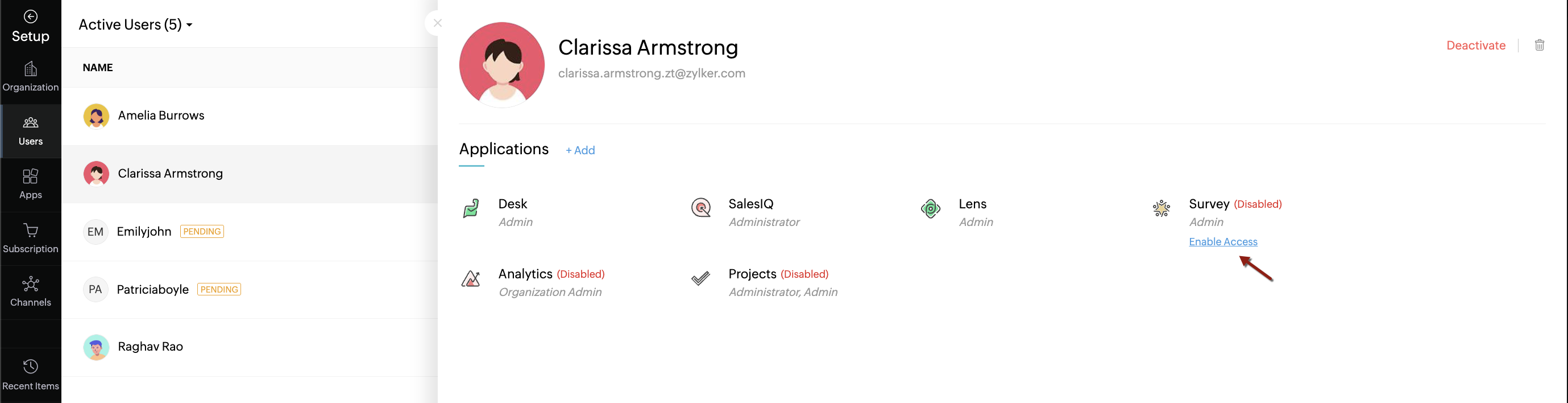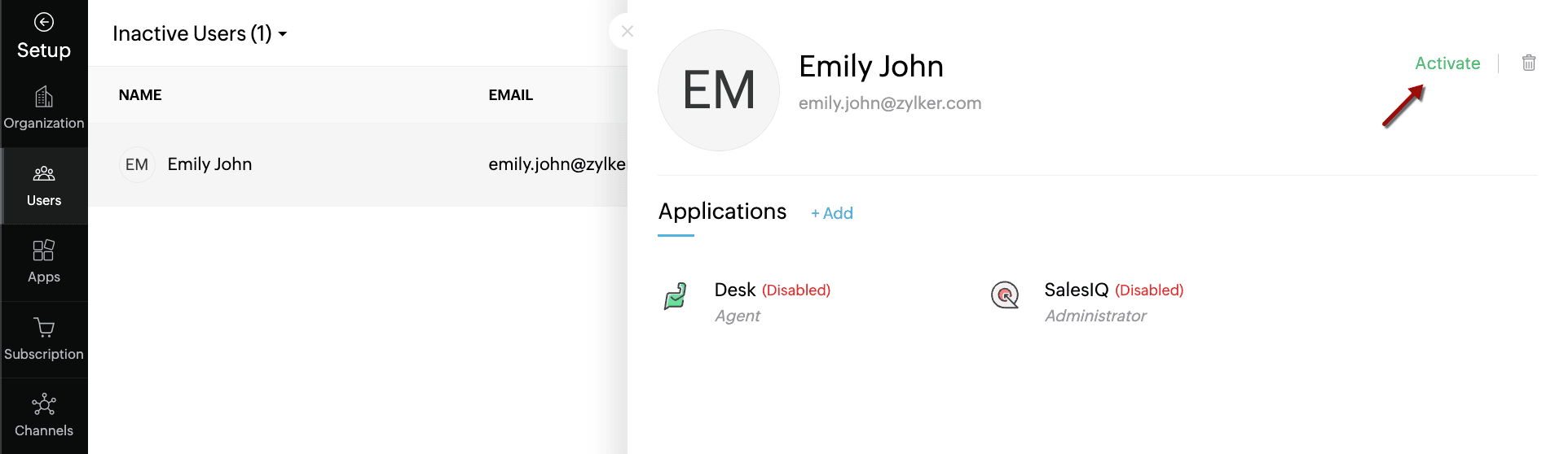 You can also select Enable Access corresponding to an application to activate the user in that application.