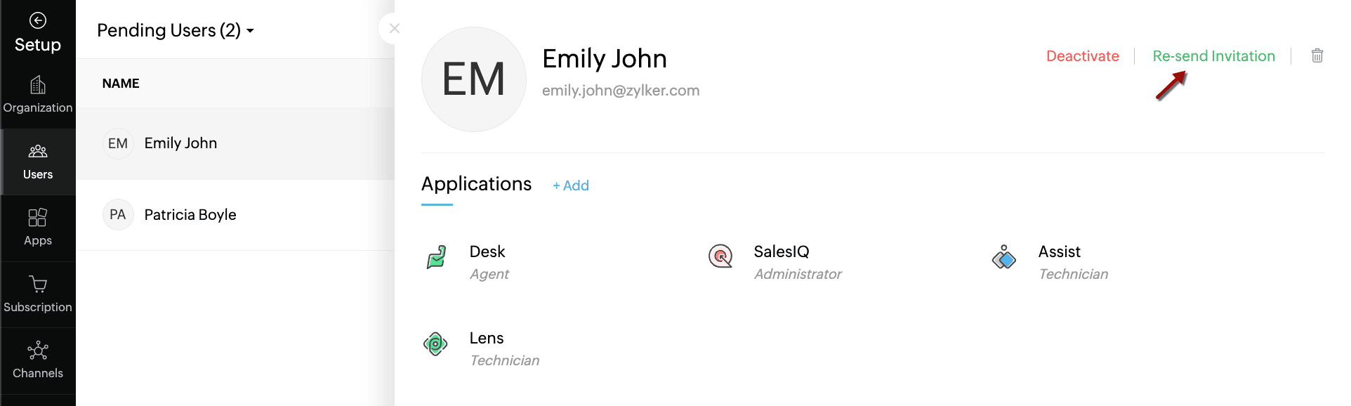 - If the user is deactivated, you must activate them first to resend an invitation.