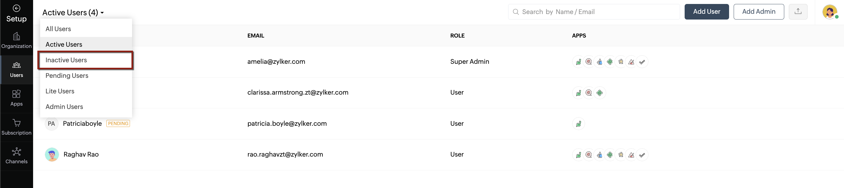 - To filter users, select the Active Users drop-down menu (it automatically defaults to Active Users) and choose an appropriate status. Users existing in the selected status will appear.