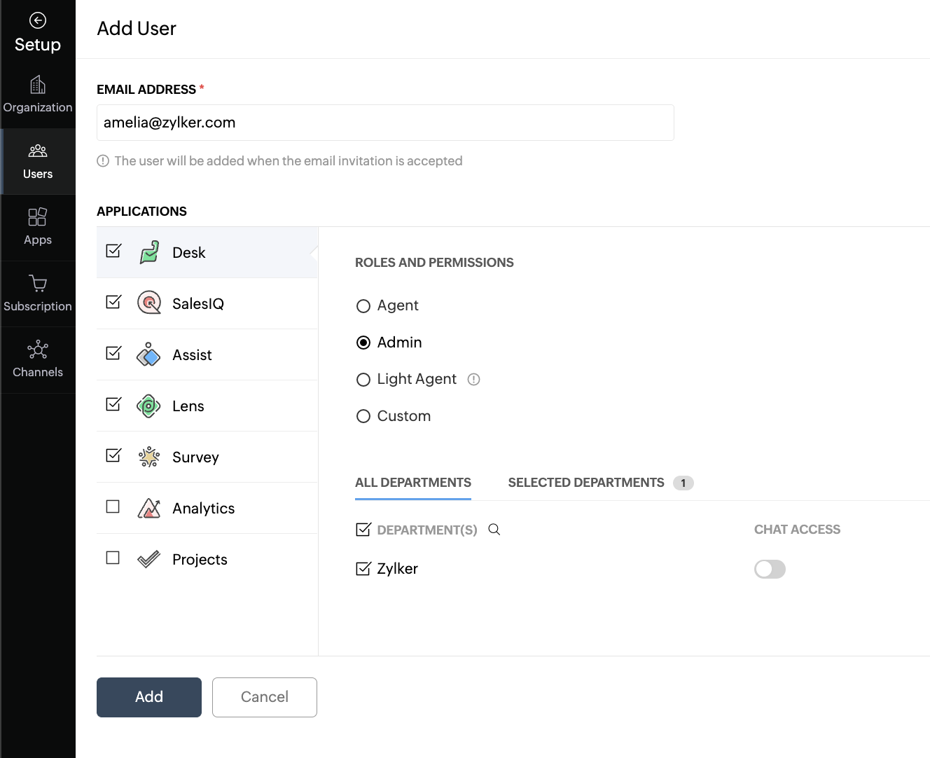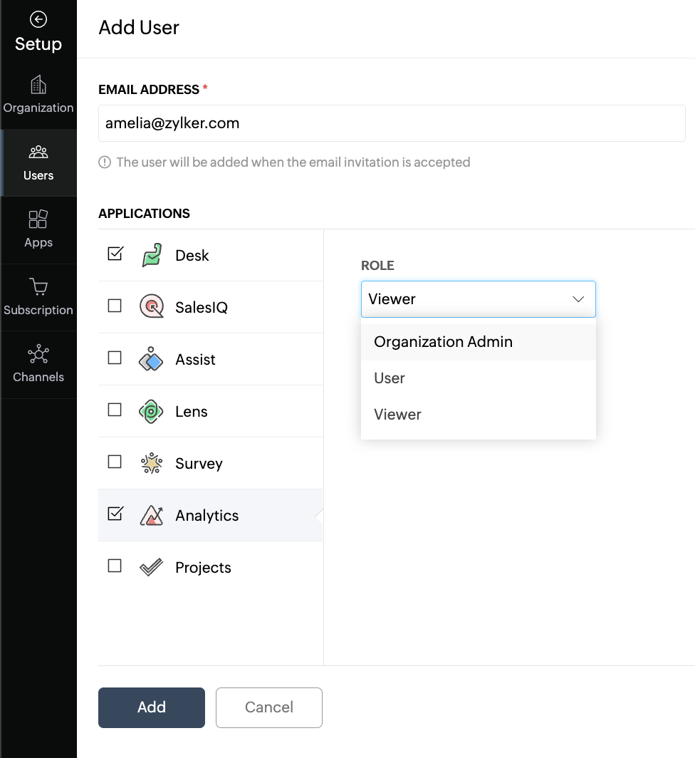 Not all users will need access to all of the applications in Service Plus. For example, you can add your customer-facing teams to the Desk account while your engineers and project managers to Projects. In such cases, you can add users to your organization and grant them access to individual applications.