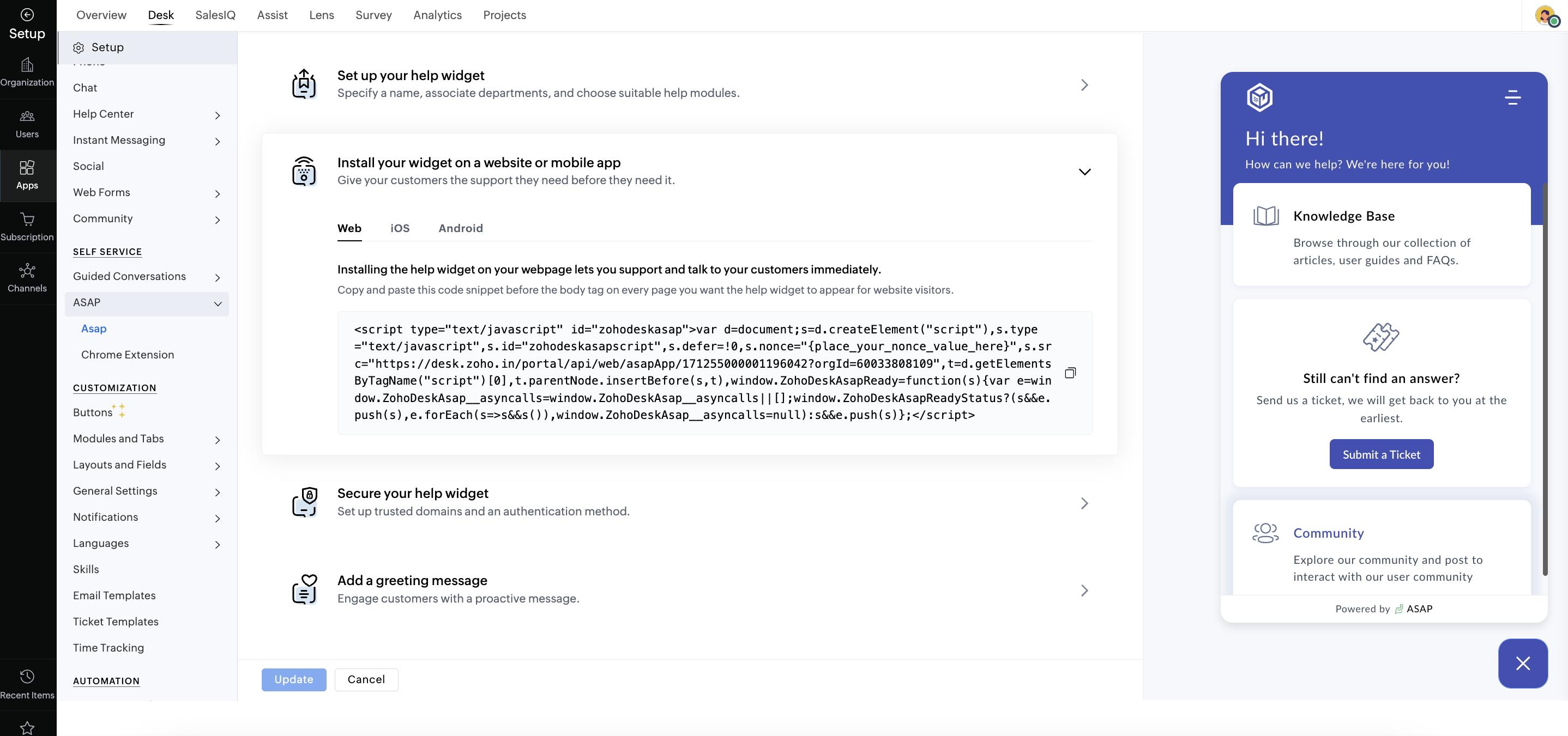 - ASAP - An embeddable solution that carries your self-service capabilities such as customer service, knowledge base, user community, live chat, Zia bot, and guided conversations into your website, mobile app, or SaaS product.