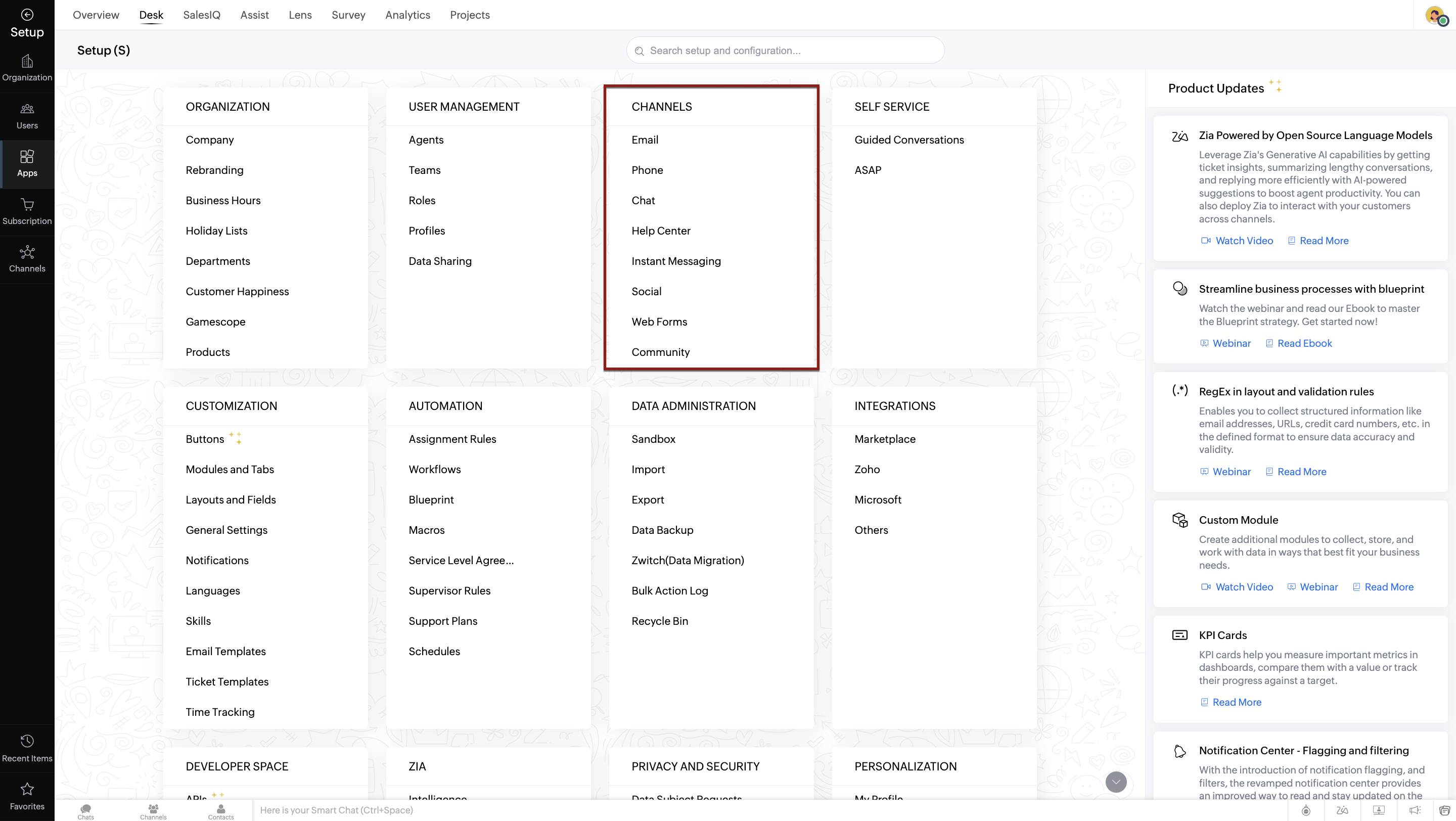 What is a customer service platform without the means to engage your customers? So it's time to set up the channels where your customers can converse with your team and submit their support tickets. Zoho Desk natively supports the following channels: