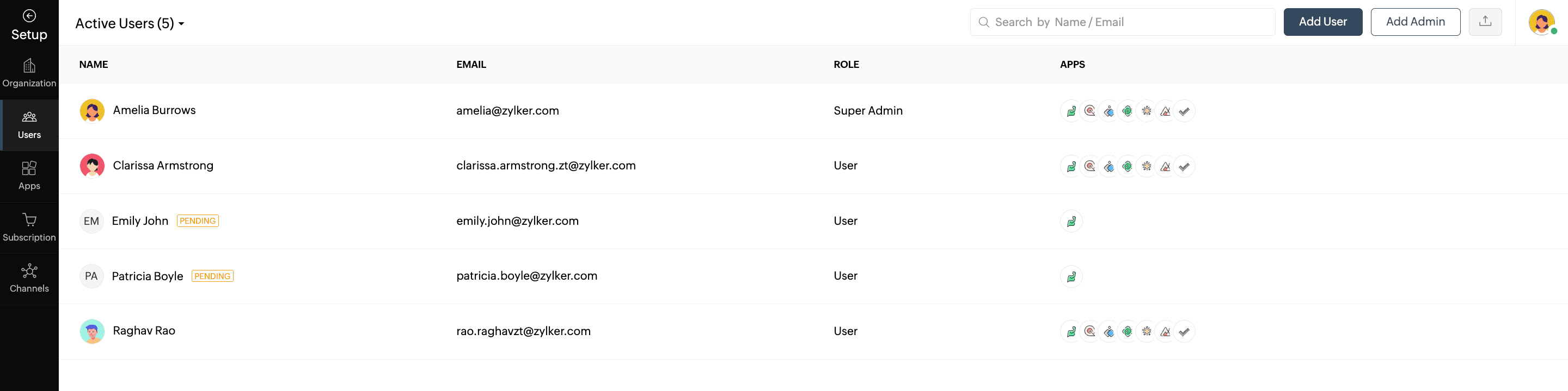 After customizing your business information, you now have to add users who help with your company's customer service. You can give each user access to certain applications to do specific tasks. For example, you can add your customer-facing teams to the Desk account while adding your engineers and project managers to Projects. In addition, you can dictate the level of access each user will have–from administration to basic access and everything in between.