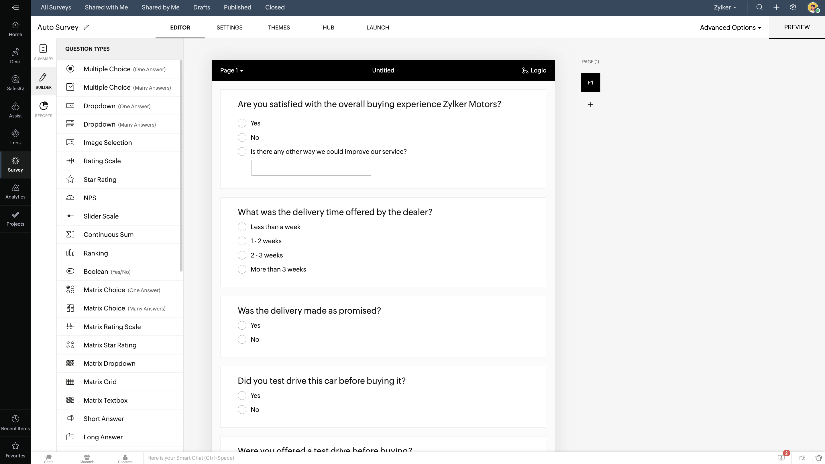Listening to your customers is an effective way to tune into what they like and dislike and spot any scope for improvement in your support process, products, and services. So creating a new survey to collect customer responses could be your next step. You can build a survey using over 25 question types and features like skip logic and piping. Once ready, you can send it to ticket requestors from inside Zoho Desk and get their feedback stored in their ticket for effortless follow-up.