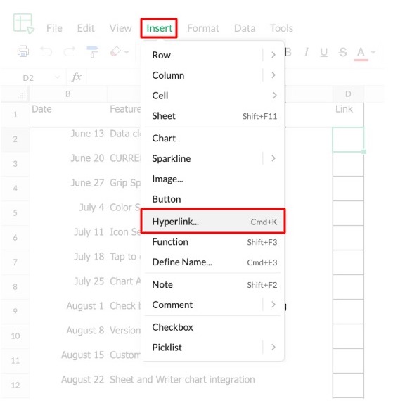 There are different places you can point to, using a hyperlink. In Zoho Sheet, you can link to a webpage, a place within the document, a telephone number or an email address.
