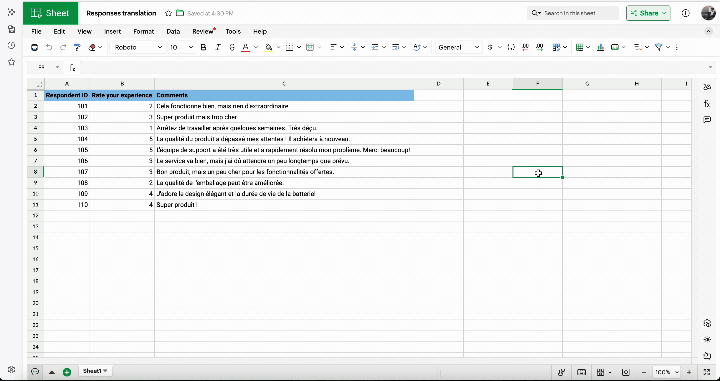 In addition to translating the text available in cells, you can also directly type in the translate panel and get them translated and insert them into a cell.
