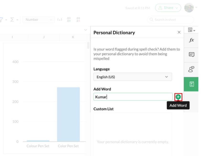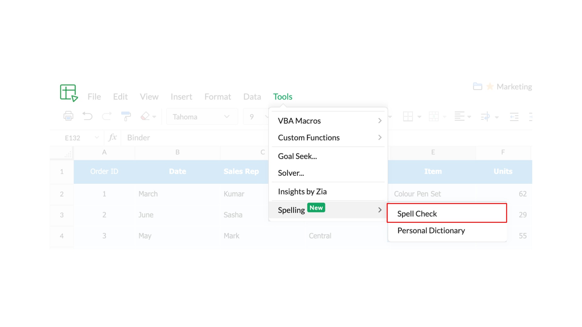 Zoho Sheet's automatic spell check helps you catch misspelt words and correct them. To use spell check,