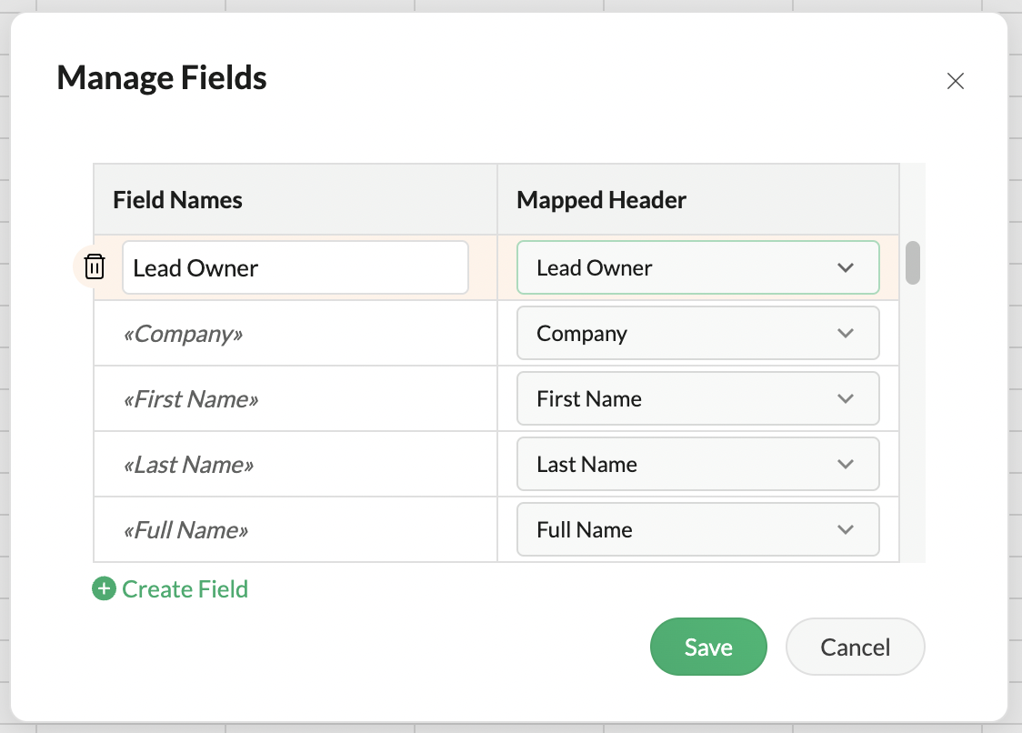 To add, edit, or delete fields in your spreadsheet: