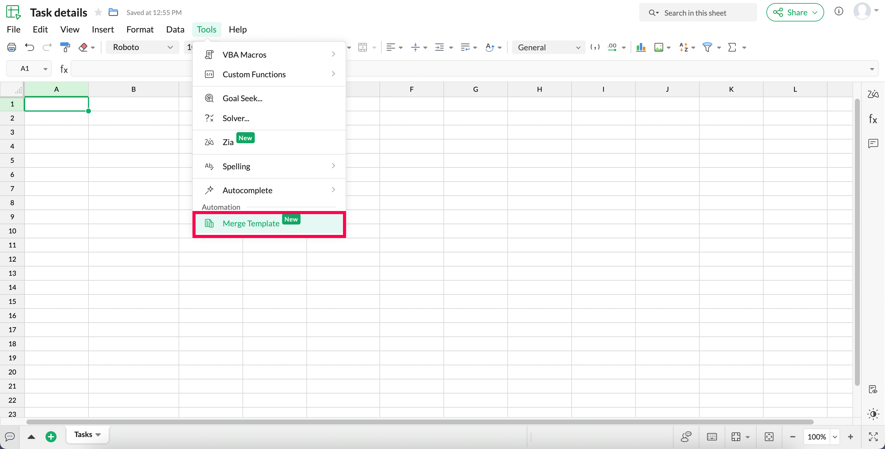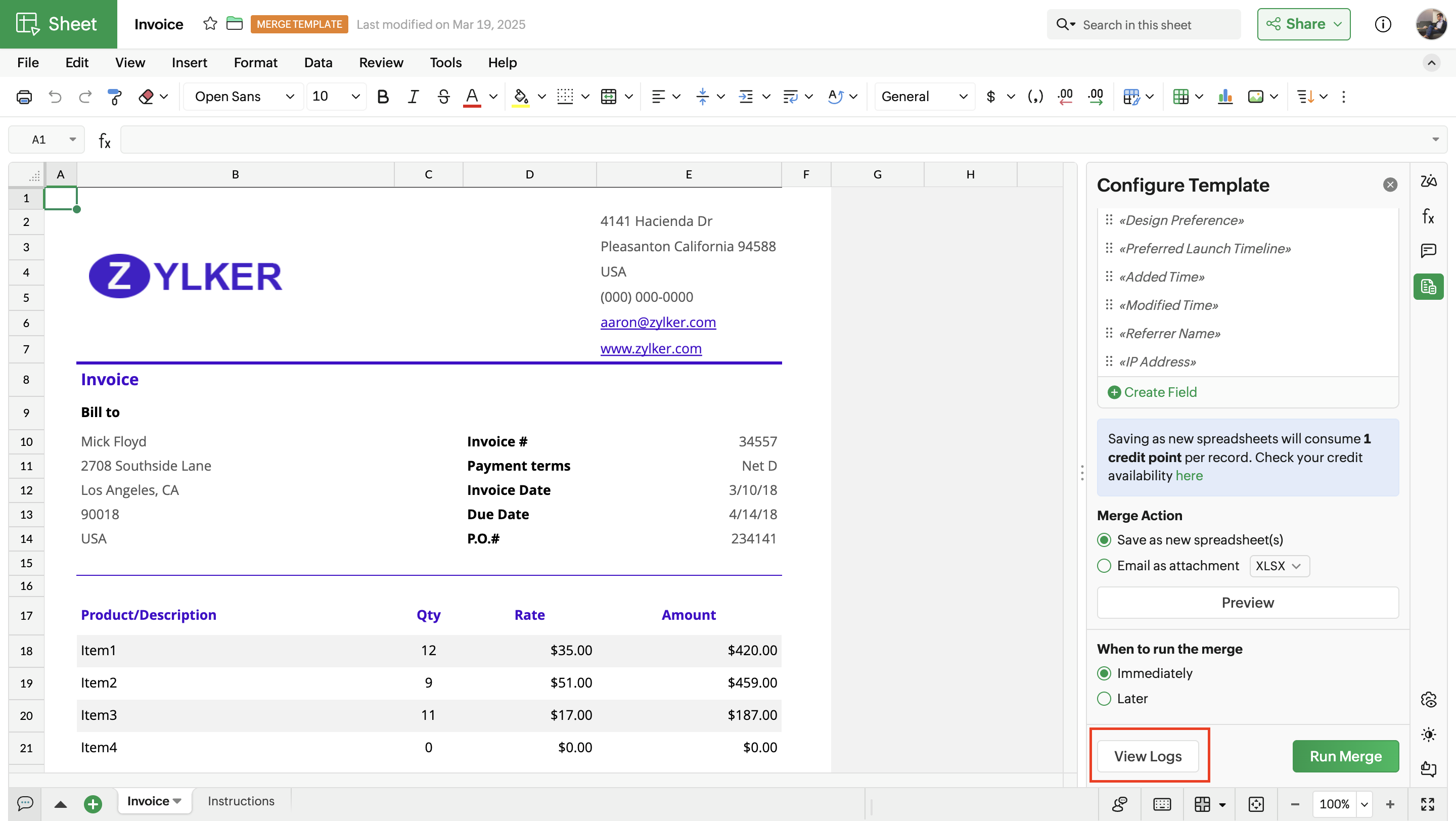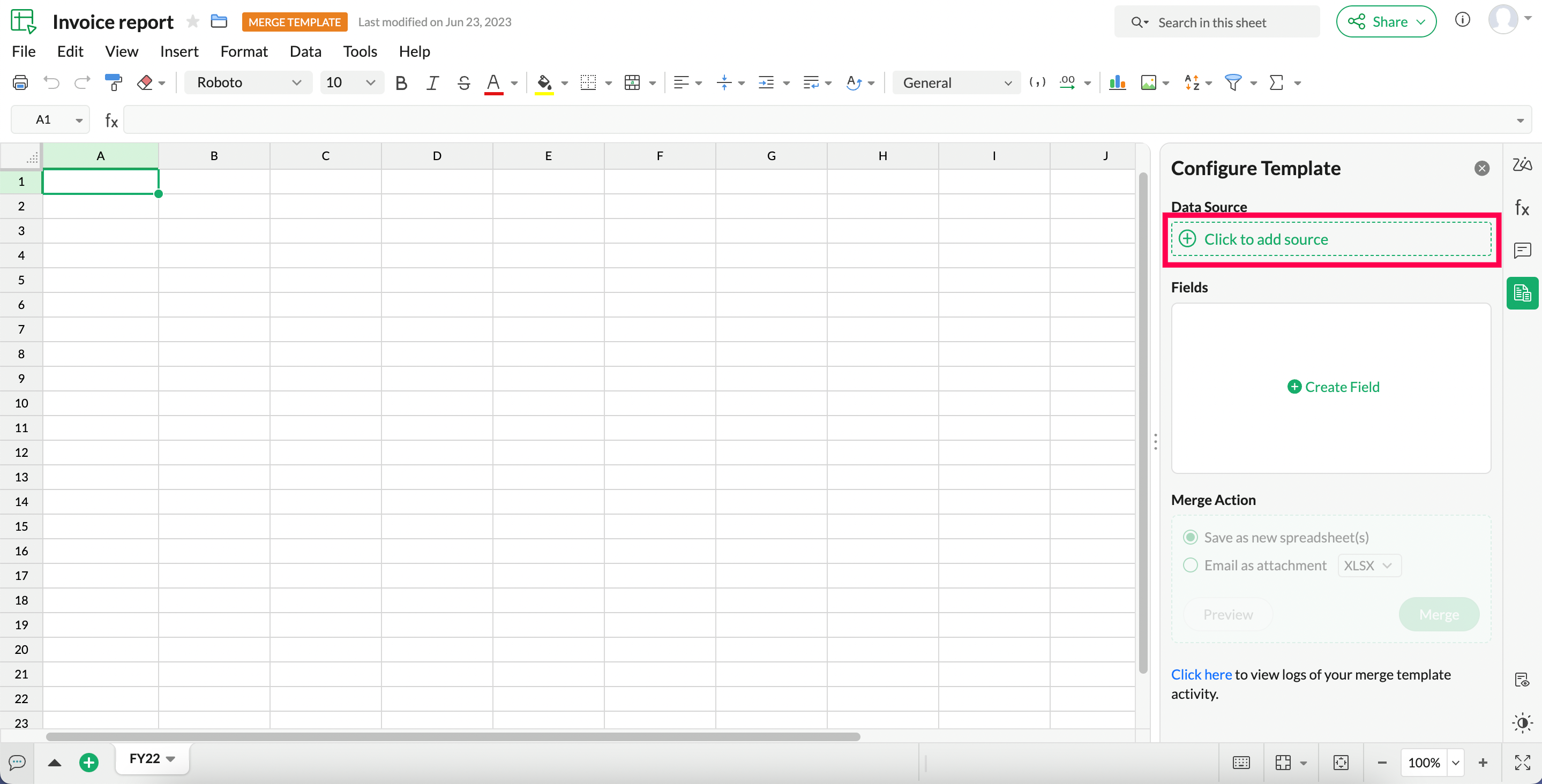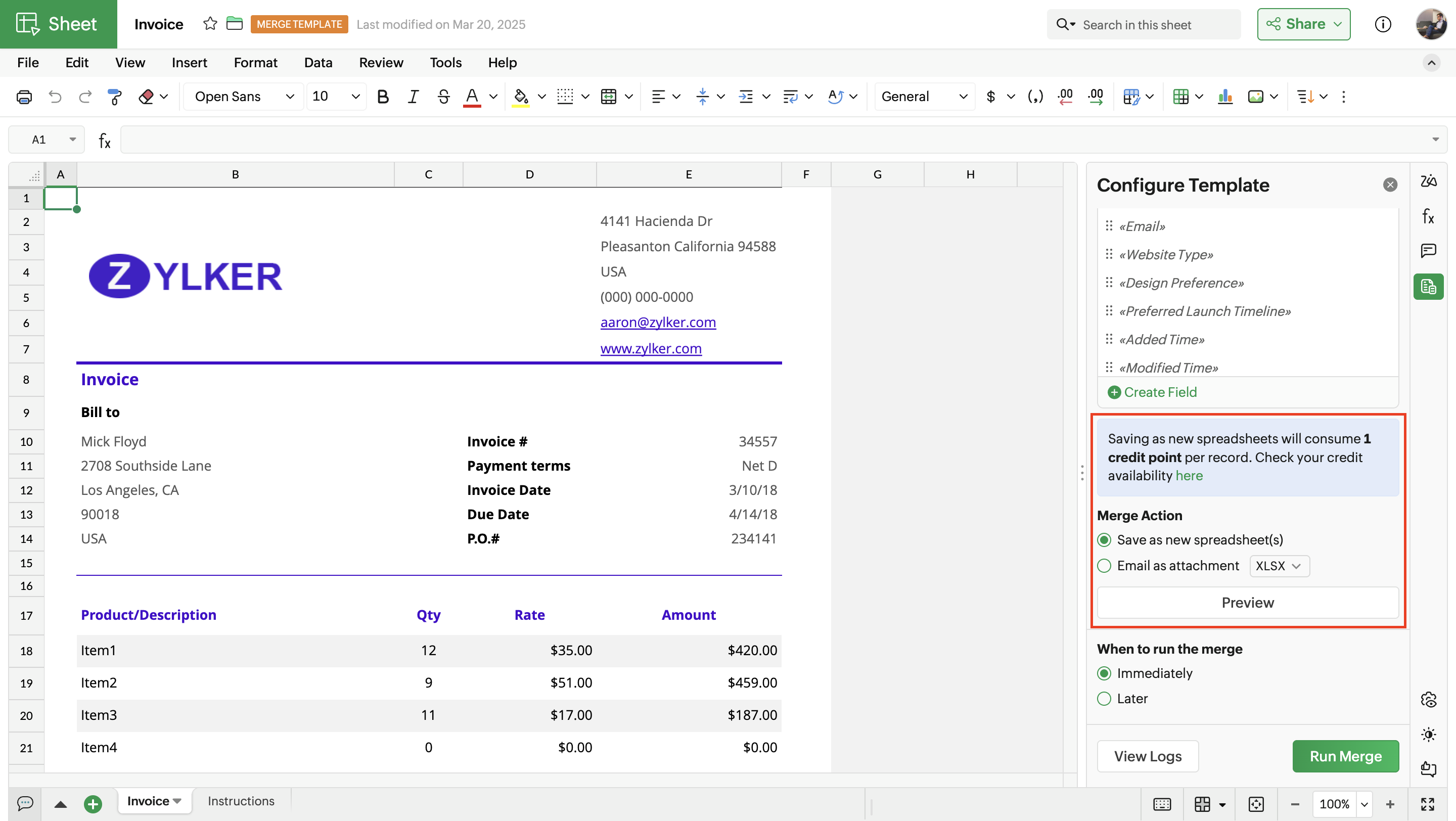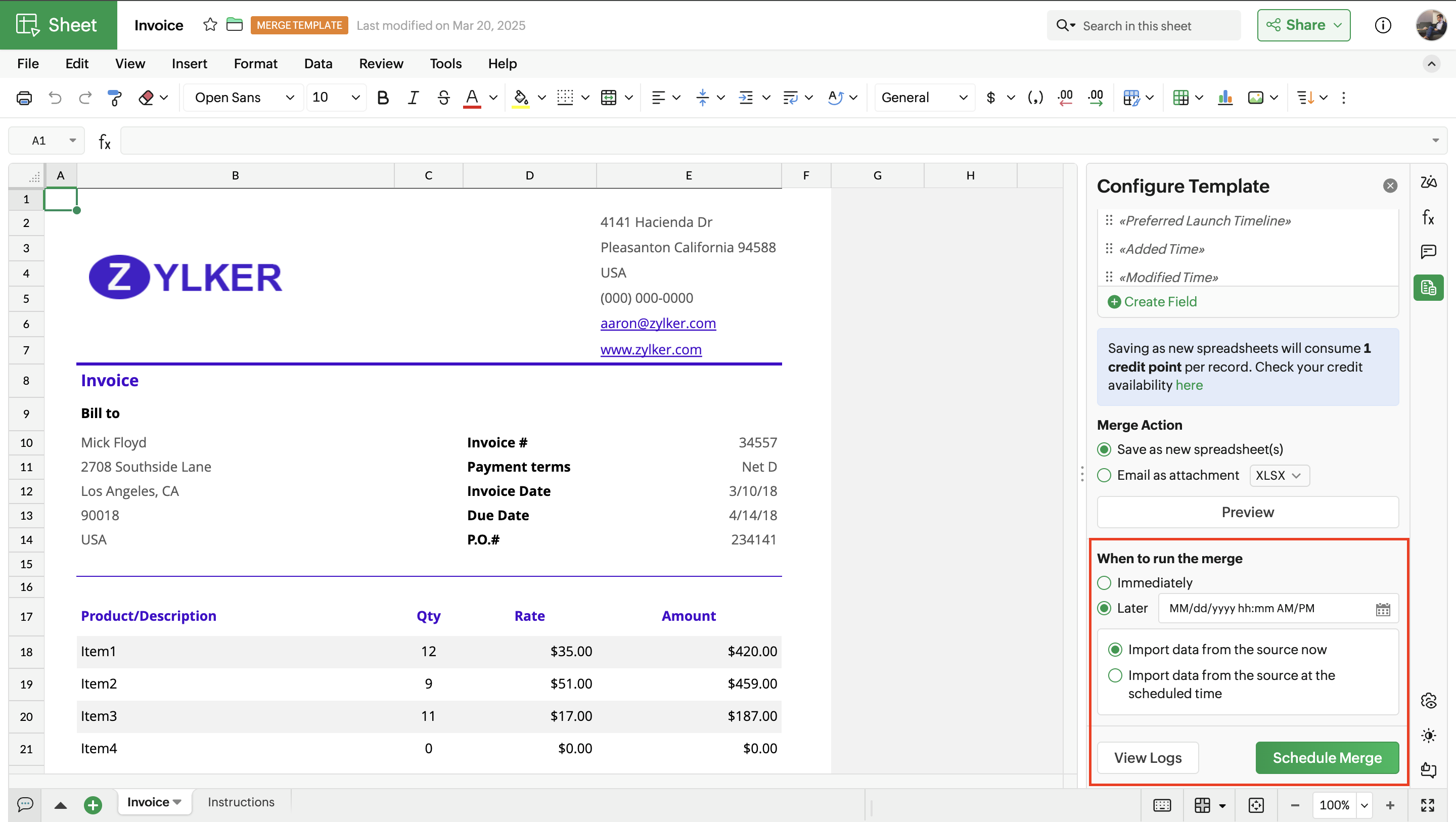 Merge Templates in Zoho Sheet allows you to create spreadsheets with dynamic data fields with data fetched from external sources, and save the data records as files in Zoho Sheet or share them via email to respective stakeholders.
