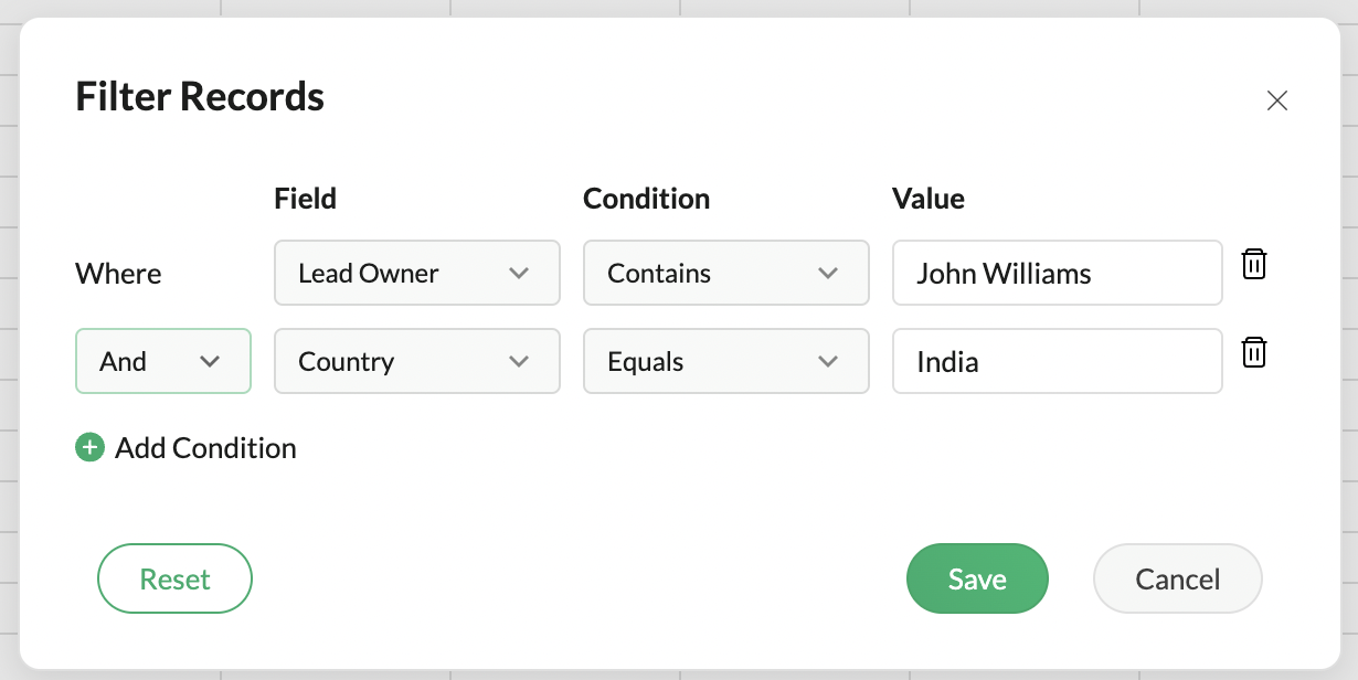 In the Filter Records dialog, choose the desired field and criteria to filter.