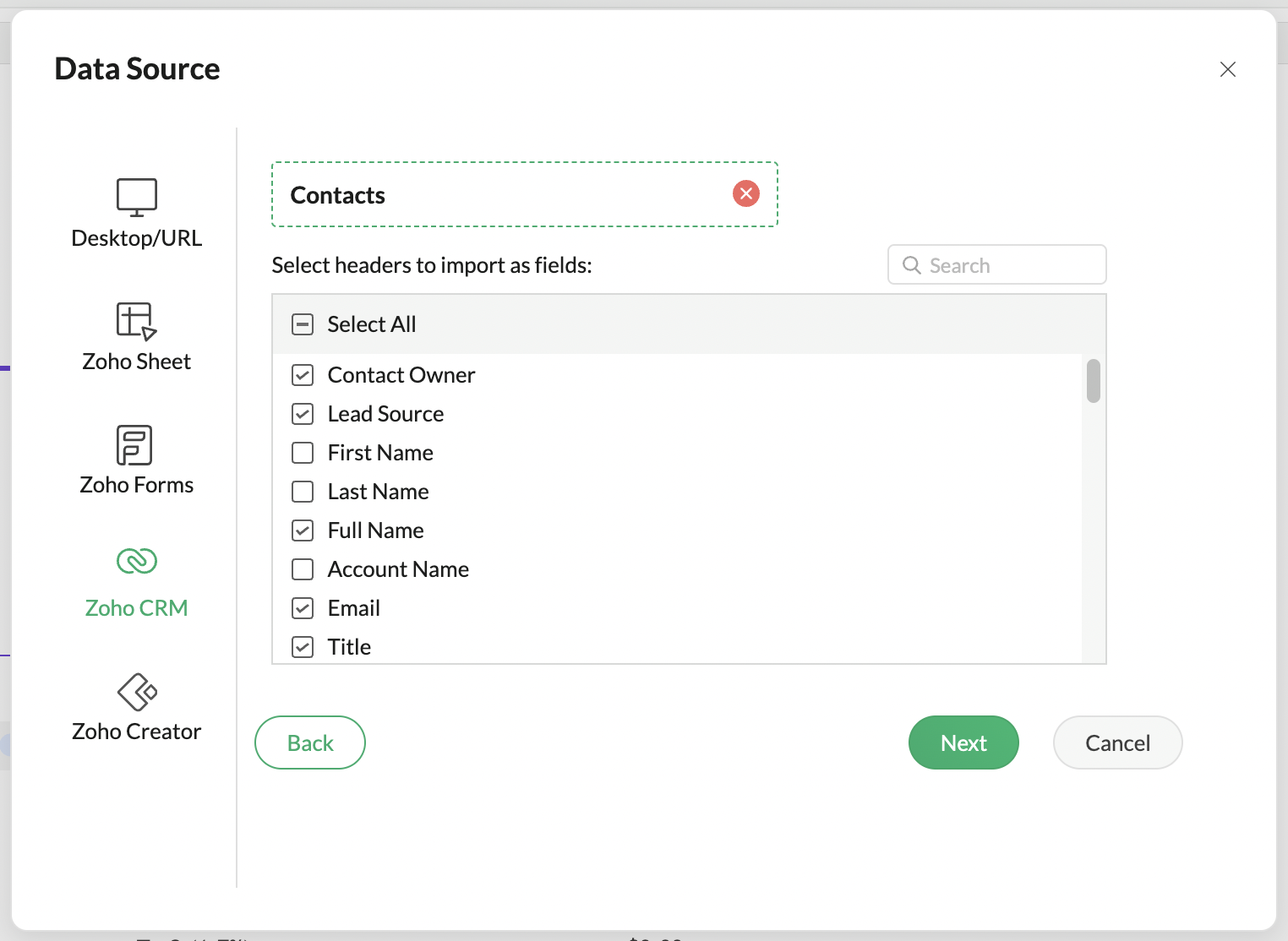For Zoho Sheet and other services (i.e. Zoho CRM, Zoho Forms and Zoho Creator), the files and modules from the respective service will be displayed for you to choose from.