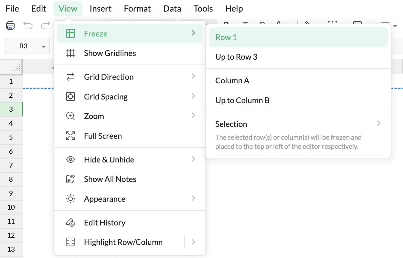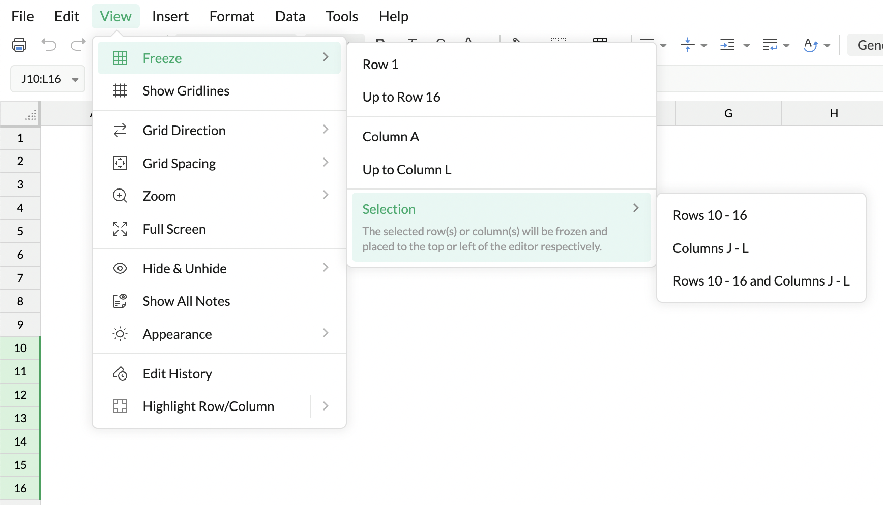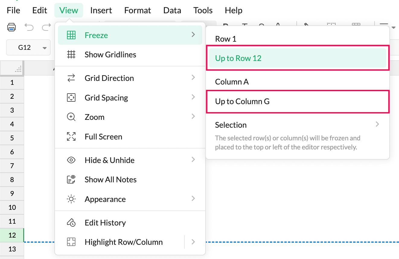 2. Click View > Freeze > Selection > choose the desired range to freeze.