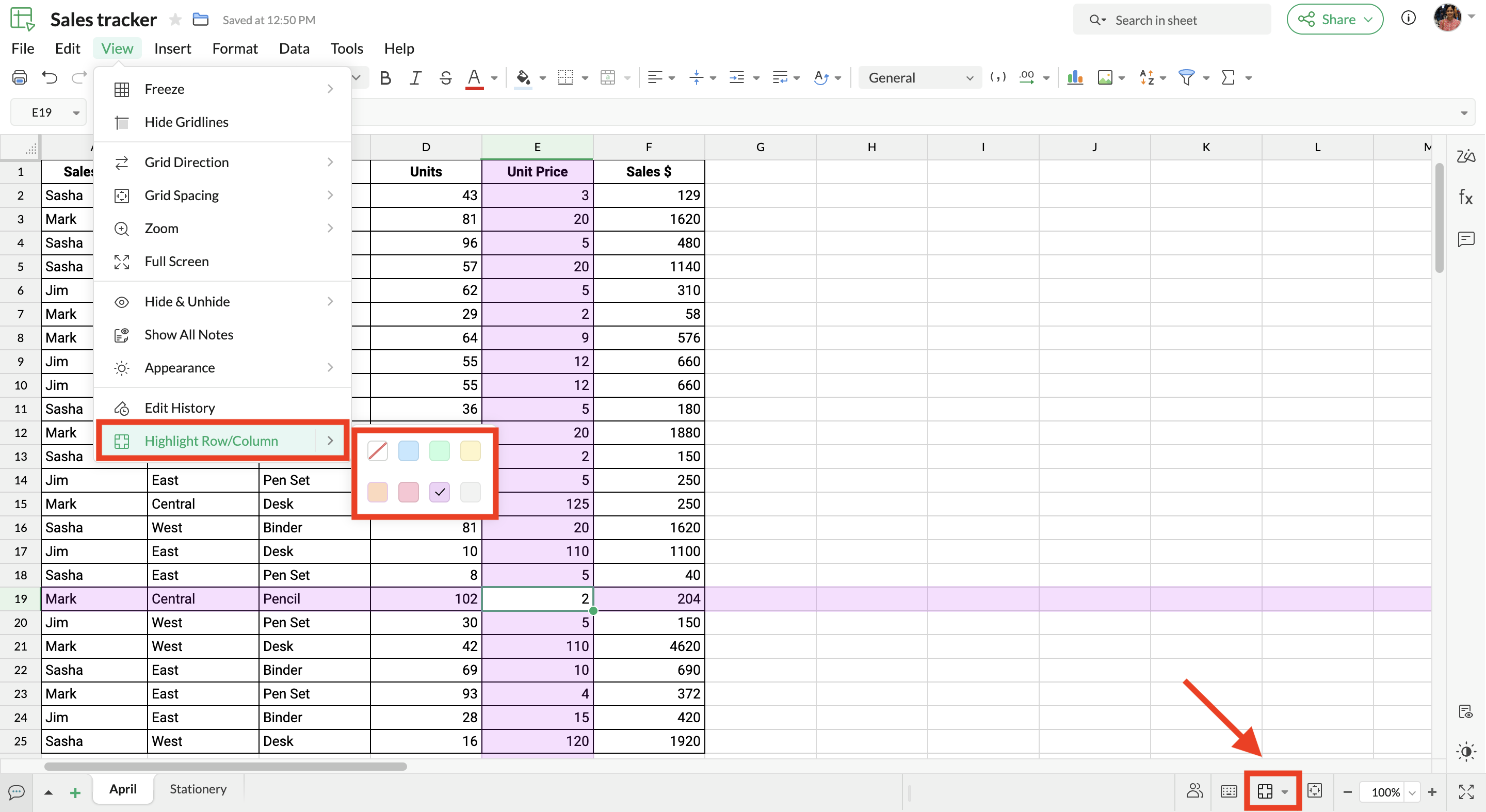 Highlight the current cell's row and column | Zoho Sheet Help Guide