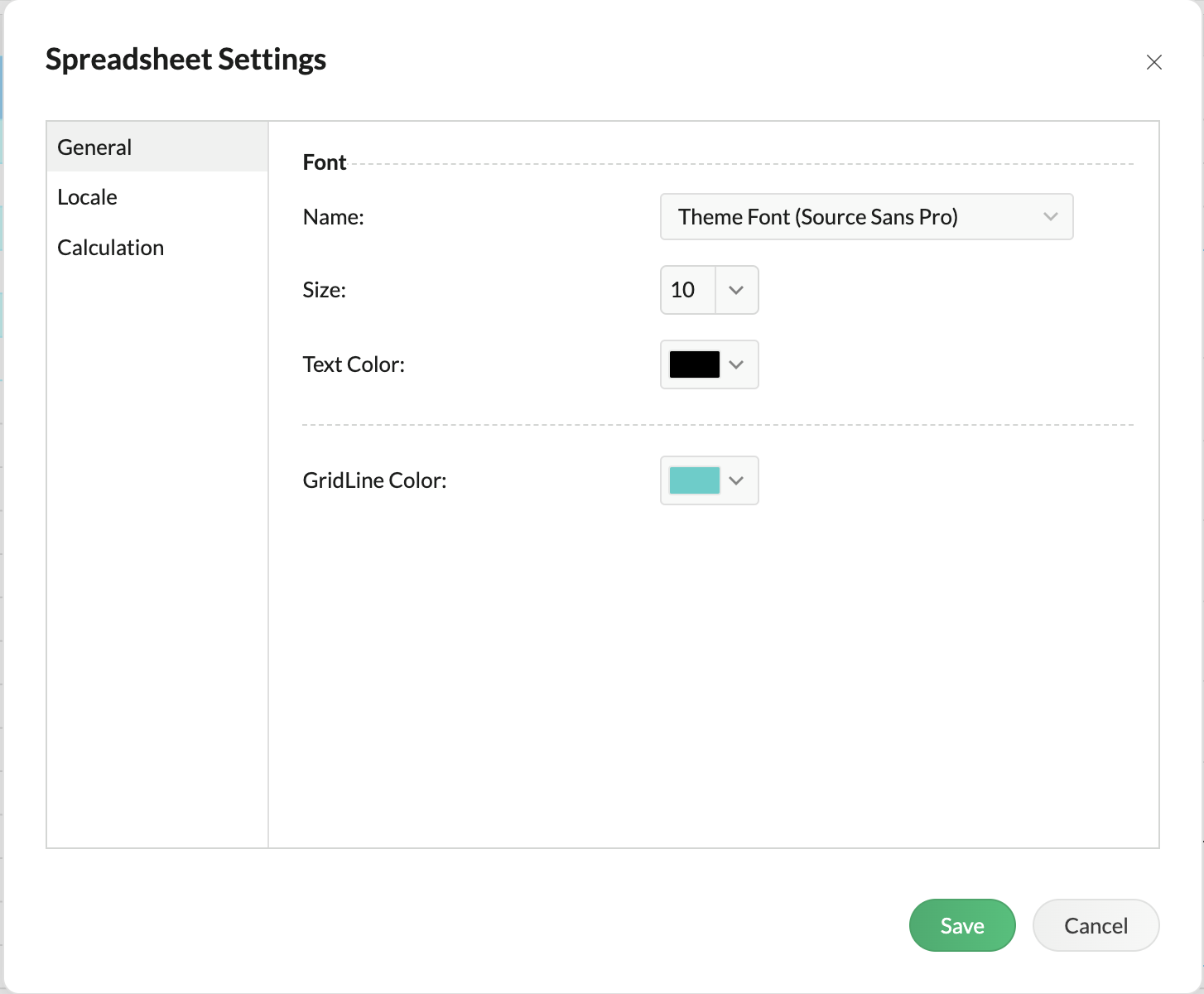 2. In the Spreadsheet Settings tab under General, select the preferred Font Name, Font Size, Text Color, and Gridline Color.