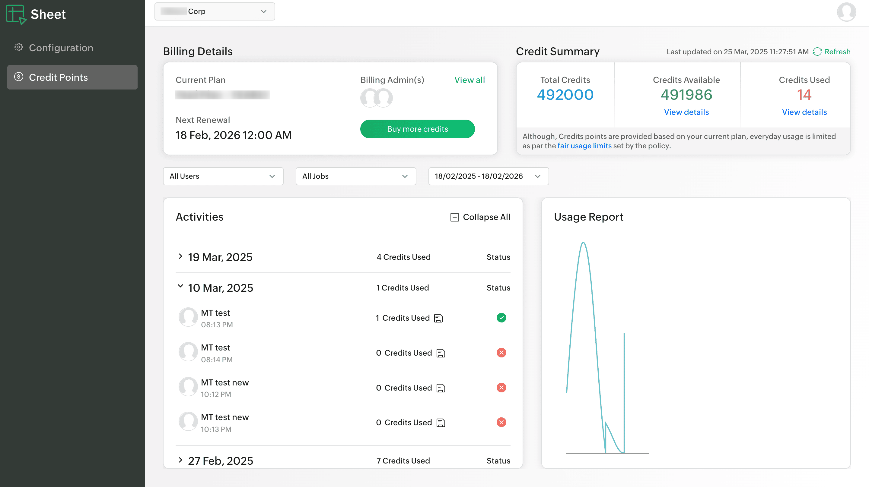 1. Credit points: Admins can view and manage the credit usage and plan details.