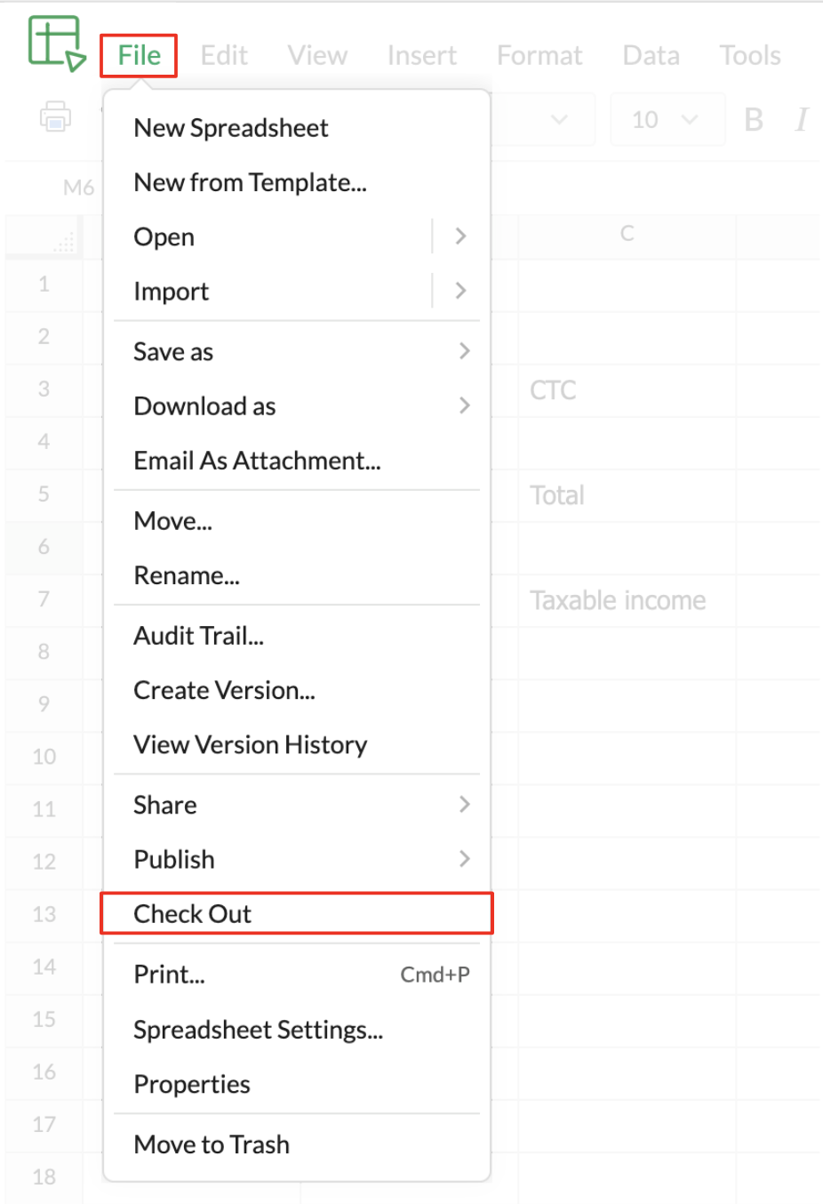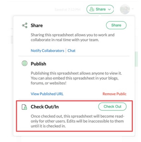 Checking out of a spreadsheet makes it read-only for all collaborators of the spreadsheet. The edits made to the spreadsheet will also be inaccessible to them, and they'll not be able to make changes to the spreadsheet until you check-in again. Here's how you check in to/out of a spreadsheet.
