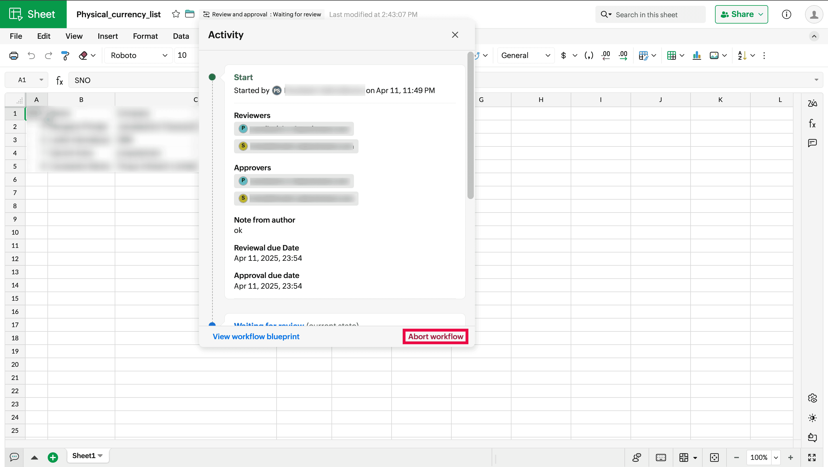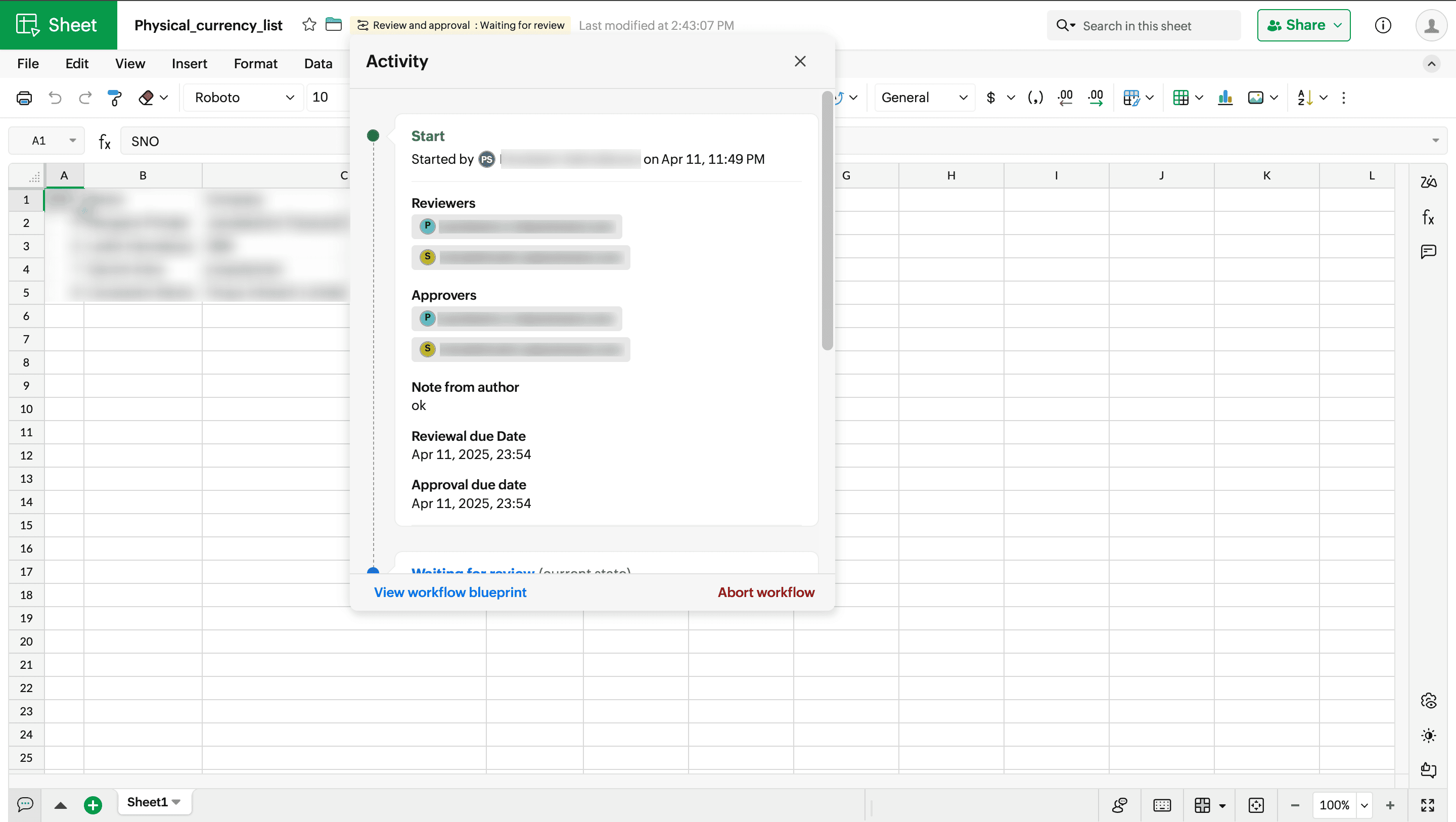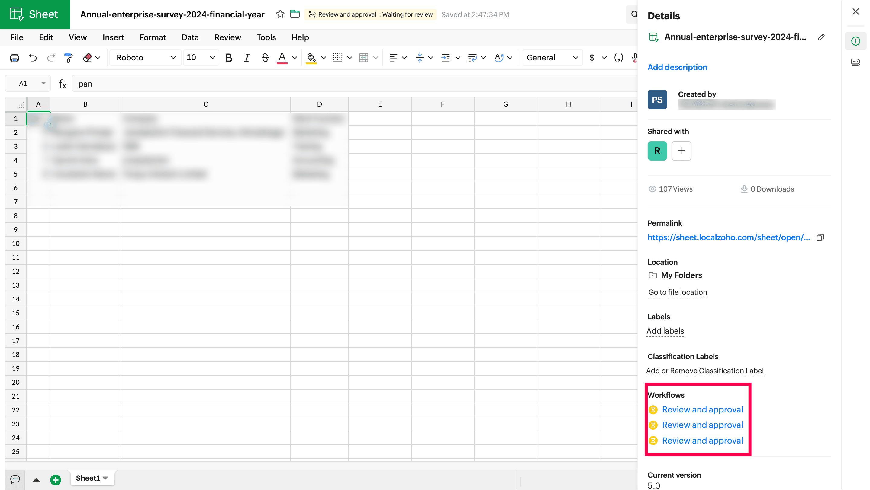 3. Review and approval workflow: This workflow allows you to share a file for both review and approval by assigning one or more reviewers and one or more approvers along with the due date to the spreadsheet file.