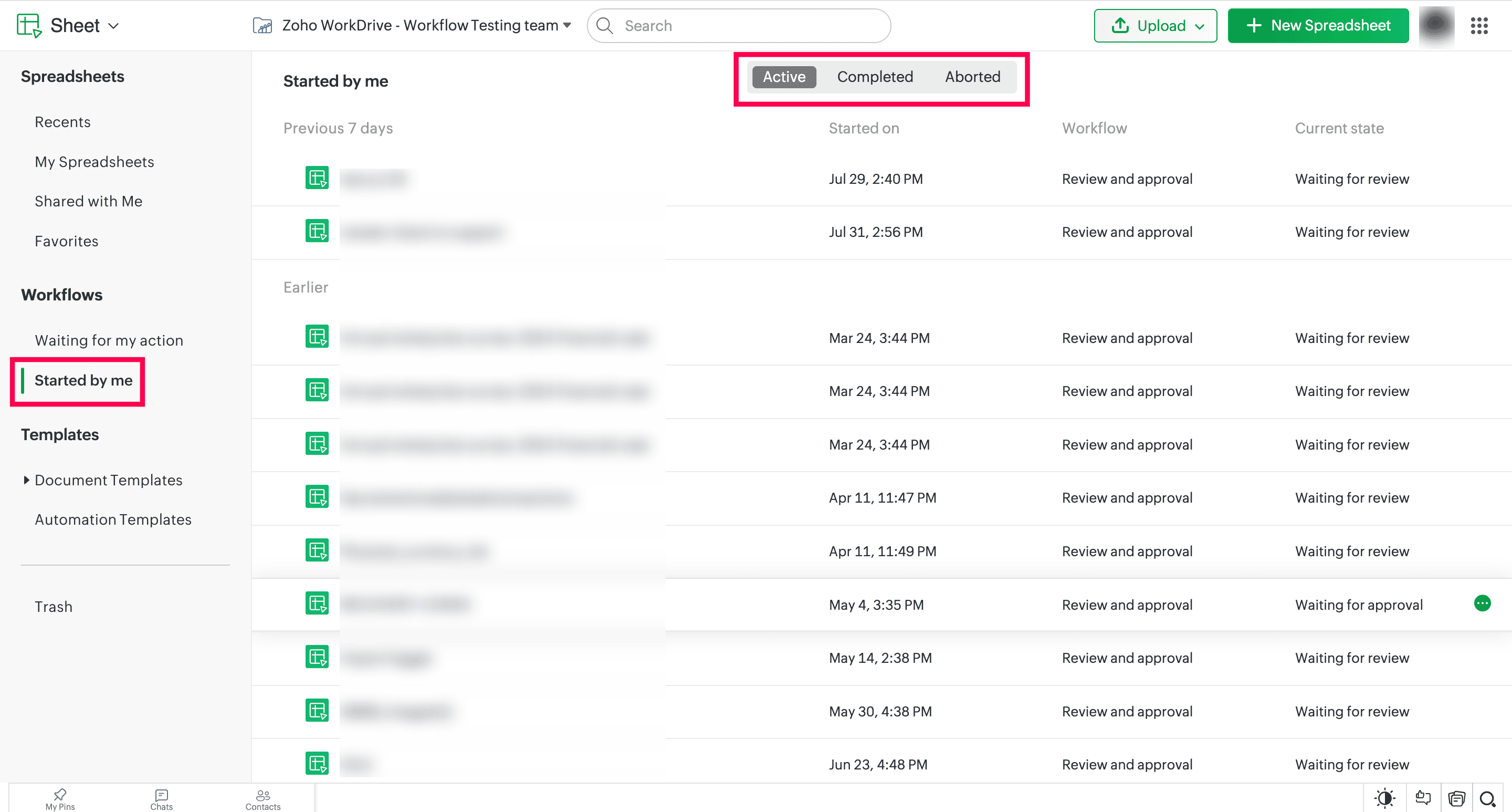 2. Under the Workflows tab, click Started by me to view all the workflows started by you and their current states.