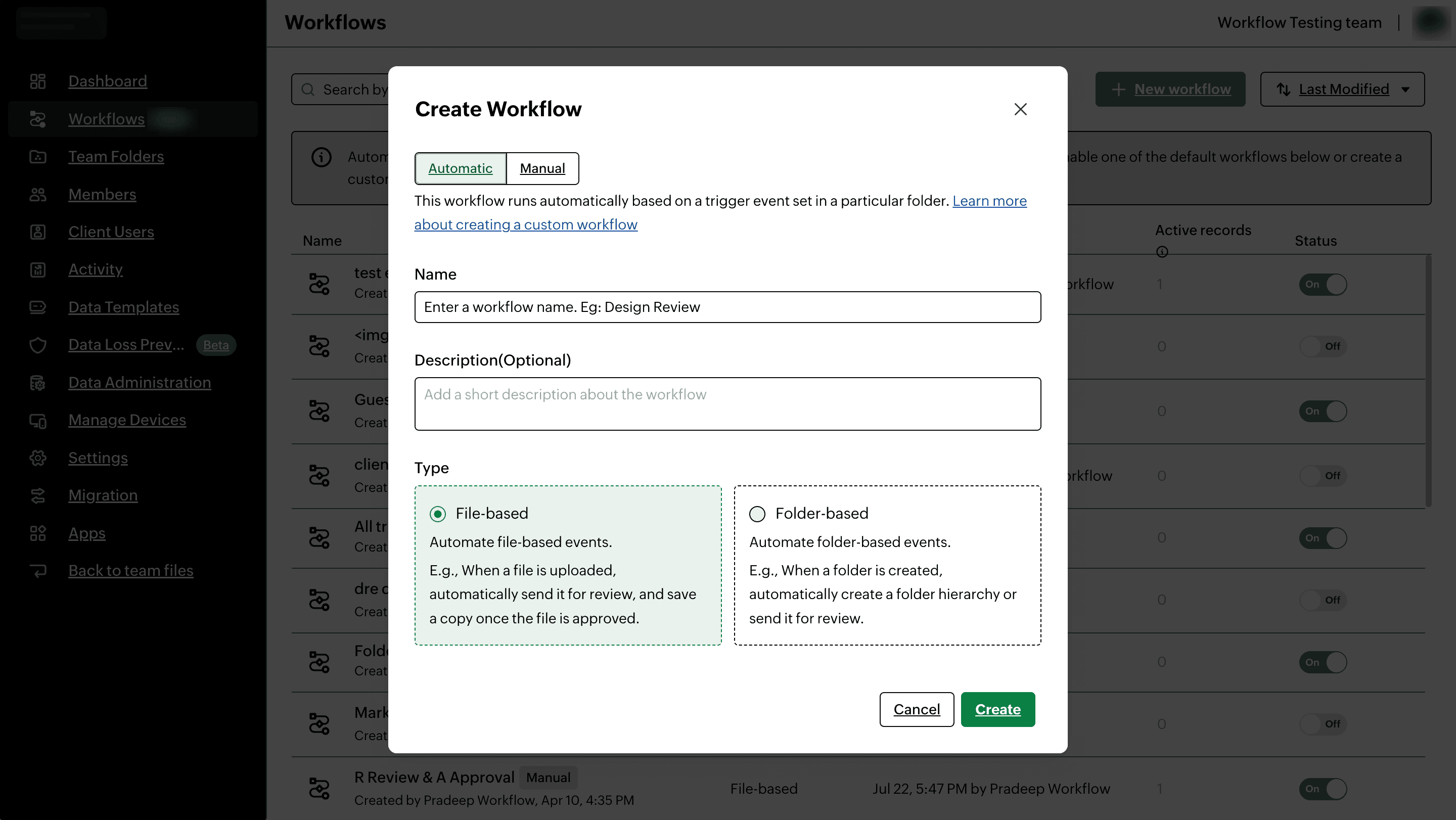 1. Navigate to File -> Workflow -> Create Workflow. This will take you to the Workflows tab in the admin panel of WorkDrive.